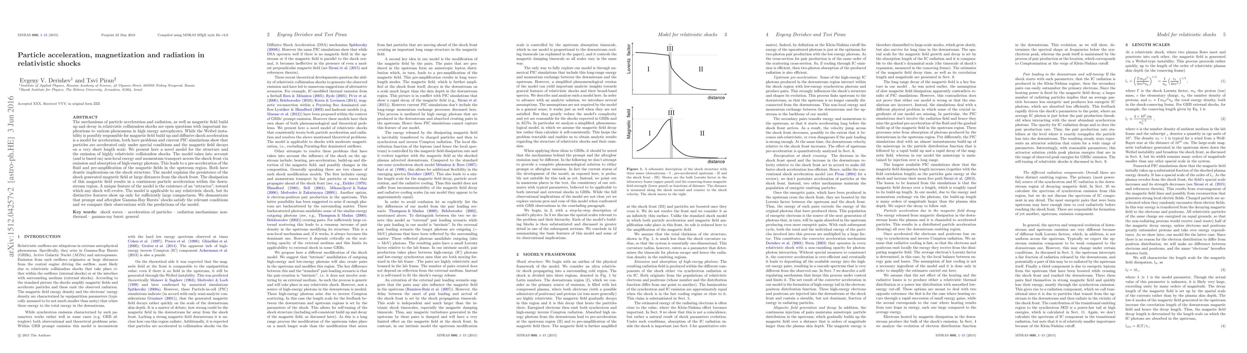 What are the mechanisms of particle acceleration and radiation, as well as magnetic field build up and decay in relativistic shocks are open questions with important implications to various phenomena in high energy astrophysics. While the Weibel instability is possibly responsible for magnetic field build up and diffusive shock acceleration is a model for acceleration, both have problems and current PIC simulation show that particles are accelerated only under special conditions and the magnetic field decays on a short length scale. We present here a novel model for the structure and the emission of highly relativistic collisionless shocks. The model takes into account (and is based on) non-local energy and momentum transport across the shock front via emission and absorption of high-energy photons. This leads to a pre-acceleration of the fluid and pre-amplificaiton of the magnetic fields in the upstream region. Both have drastic implications on the shock structure. The model explains the persistence of the shock generated magnetic field at large distances from the shock front. The dissipation of this magnetic field results in a continuous particle acceleration within the downstream region. The model suggests two non-uniform emission zones (the downstream and the upstream), that give rise to three emission components with different spectral and temporal properties. A unique feature of the model is the existence of an "attractor", toward which any shock will evolve. This enables us to estimate from first principles the synchrotron and inverse Compton spectrum of the downstream emission. The model is applicable to any relativistic shock, but its distinctive features show up only for large compactness. We demonstrate that prompt and afterglow Gamma-Ray Bursts' shocks satisfy the relevant conditions and compare their observations with the predictions.