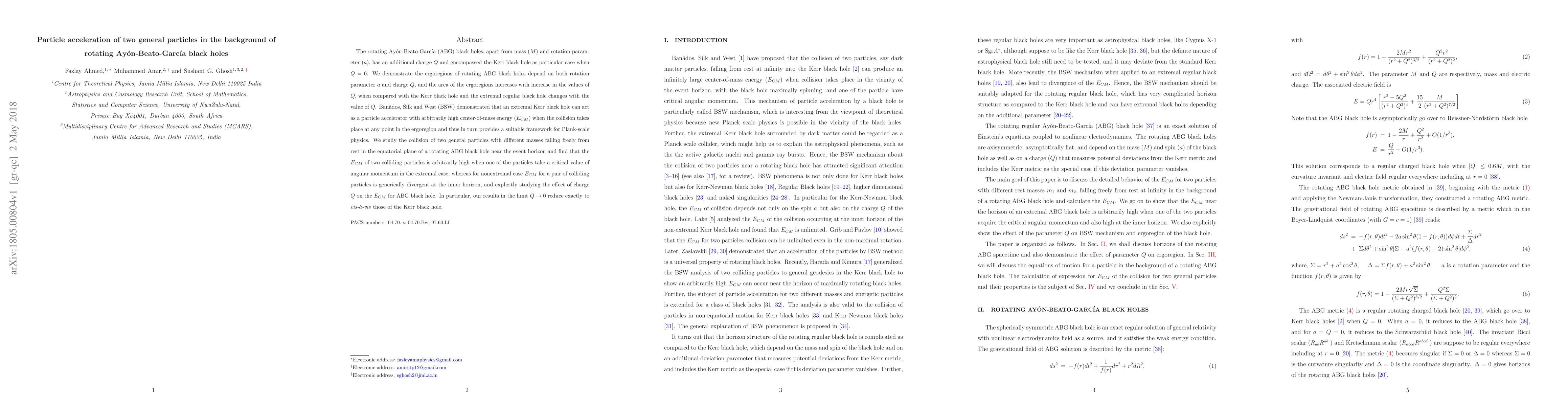 The rotating Ay\'{o}n-Beato-Garc\'{i}a (ABG) black holes, apart from mass ($M$) and rotation parameter ($a$), has an additional charge $Q$ and encompassed the Kerr black hole as particular case when $Q=0$. We demonstrate the ergoregions of rotating ABG black holes depend on both rotation parameter $a$ and charge $Q$, and the area of the ergoregions increases with increase in the values of $Q$, when compared with the Kerr black hole and the extremal regular black hole changes with the value of $Q$. Ban{\~a}dos, Silk and West (BSW) demonstrated that an extremal Kerr black hole can act as a particle accelerator with arbitrarily high center-of-mass energy ($E_{CM}$) when the collision takes place at any point in the ergoregion and thus in turn provides a suitable framework for Plank-scale physics. We study the collision of two general particles with different masses falling freely from rest in the equatorial plane of a rotating ABG black hole near the event horizon and find that the $E_{CM}$ of two colliding particles is arbitrarily high when one of the particles take a critical value of angular momentum in the extremal case, whereas for nonextremal case $E_{CM}$ for a pair of colliding particles is generically divergent at the inner horizon, and explicitly studying the effect of charge $Q$ on the $E_{CM}$ for ABG black hole. In particular, our results in the limit $Q\rightarrow 0$ reduce exactly to \emph{vis-$\grave{a}$-vis} those of the Kerr black hole.