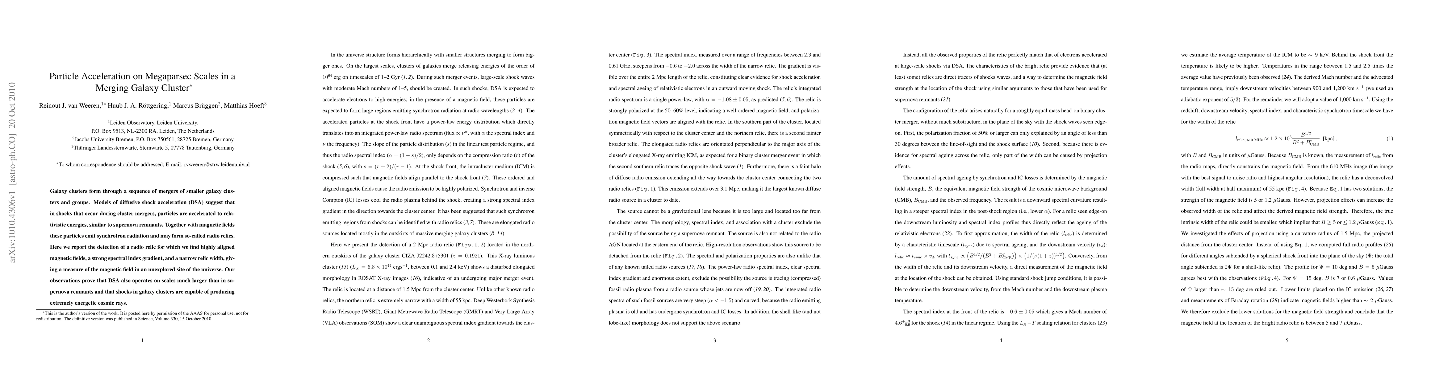 Scientists have detected a radio relic in a galaxy cluster, showing that particle acceleration occurs on megaparsec scales, producing extremely energetic cosmic rays.