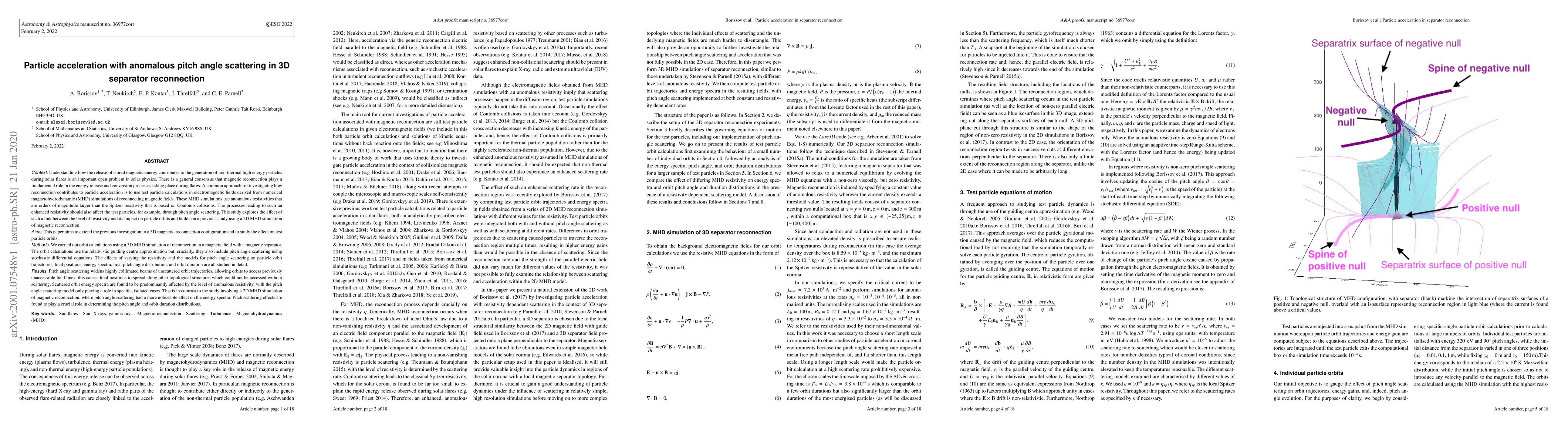 Understanding how the release of stored magnetic energy contributes to the generation of non-thermal high energy particles during solar flares is an important open problem in solar physics. Magnetic reconnection plays a fundamental role in the energy release and conversion processes taking place during flares. A common approach for investigating particle acceleration is to use test particles in fields derived from magnetohydrodynamic (MHD) simulations of reconnection. These MHD simulations use anomalous resistivities that are much larger than the Spitzer resistivity based on Coulomb collisions. The processes leading to enhanced resistivity should also affect the test particles. We explore the link between resistivity and particle orbits building on a previous study using a 2D MHD simulation of magnetic reconnection. This paper extends the previous investigation to a 3D magnetic reconnection configuration and to study the effect on test particle orbits. We carried out orbit calculations using a 3D MHD simulation of separator reconnection. We use the relativistic guiding centre approximation including stochastic pitch angle scattering. The effects of varying the resistivity and the models for pitch angle scattering on particle orbit trajectories, final positions, energy spectra, final pitch angle distribution, and orbit duration are all studied in detail. Pitch angle scattering widens collimated beams of orbit trajectories, allowing orbits to access previously unaccessible field lines; this causes final positions to spread to topological structures that were previously inaccessible. Scattered orbit energy spectra are found to be predominantly affected by the level of anomalous resistivity, with the pitch angle scattering model only playing a role in isolated cases. Scattering is found to play a crucial role in determining the pitch angle and orbit duration distributions.