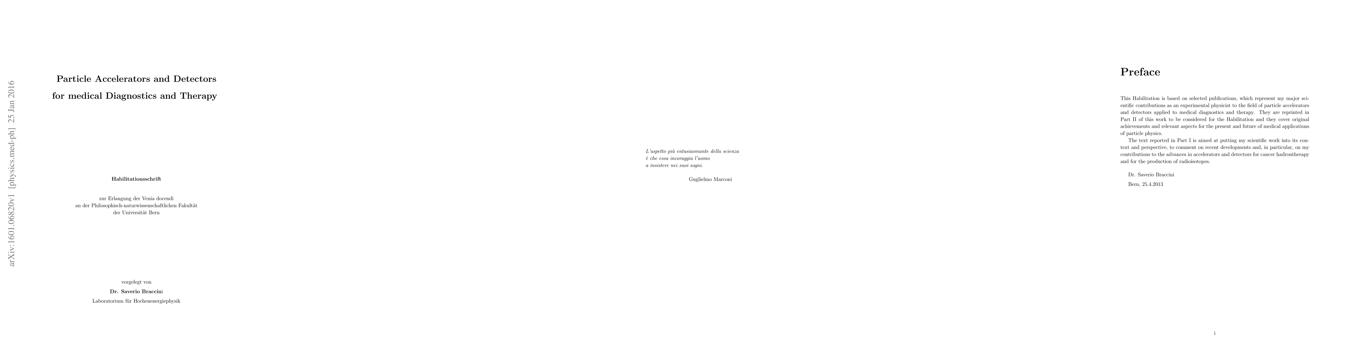 This Habilitationsschrift (Habilitation thesis) is focused on my research activities on medical applications of particle physics and was written in 2013 to obtain the Venia Docendi (Habilitation) in experimental physics at the University of Bern. It is based on selected publications, which represented at that time my major scientific contributions as an experimental physicist to the field of particle accelerators and detectors applied to medical diagnostics and therapy. The thesis is structured in two parts. In Part I, Chapter 1 presents an introduction to accelerators and detectors applied to medicine, with particular focus on cancer hadrontherapy and on the production of radioactive isotopes. In Chapter 2, my publications on medical particle accelerators are introduced and put into their perspective. In particular, high frequency linear accelerators for hadrontherapy are discussed together with the new Bern cyclotron laboratory. Chapter 3 is dedicated to particle detectors with particular emphasis on three instruments I contributed to propose and develop: segmented ionization chambers for hadrontherapy, a proton radiography apparatus with nuclear emulsion films, and a beam monitor detector for ion beams based on doped silica fibres. Selected research and review papers are contained in Part II. For copyright reasons, they are only listed and not reprinted in this on-line version. They are available on the websites of the journals.