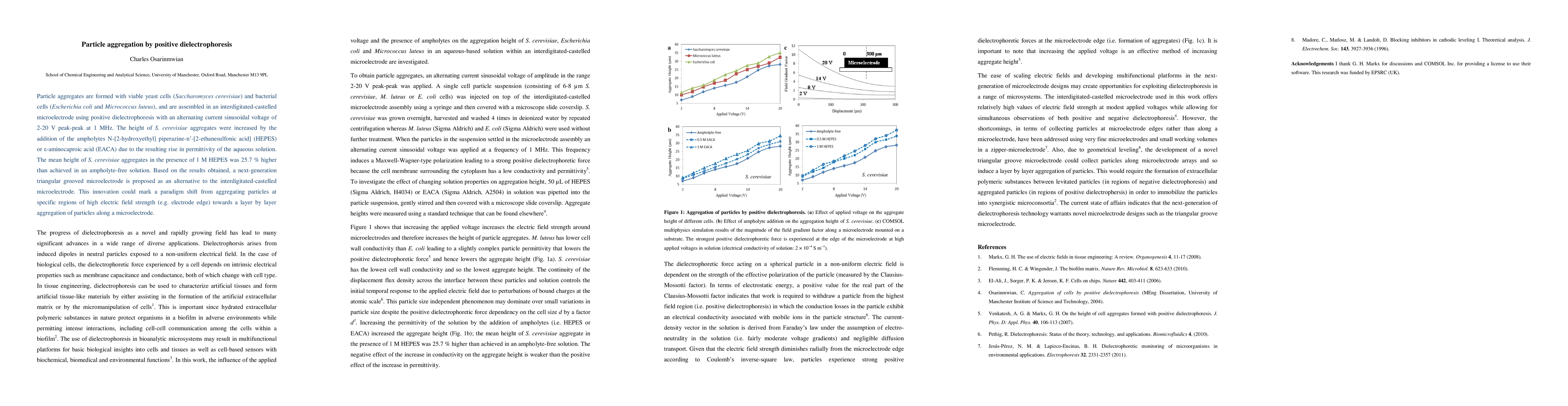 Particle aggregates are formed with viable yeast cells (Saccharomyces cerevisiae) and bacterial cells (Escherichia coli and Micrococcus luteus), and are assembled in an interdigitated-castelled microelectrode using positive dielectrophoresis with an alternating current sinusoidal voltage of 2-20 V peak-peak at 1 MHz. The height of S. cerevisiae aggregates are increased by the addition of the ampholytes N-[2-hydroxyethyl] piperazine-n'-[2-ethanesulfonic acid] (HEPES) or e-aminocaproic acid (EACA) due to the resulting rise in permittivity of the aqueous solution. The mean height of S. cerevisiae aggregates in the presence of 1 M HEPES was 25.7 % higher than achieved in an ampholyte-free solution. Based on the results obtained, a next-generation triangular grooved microelectrode is proposed as an alternative to the interdigitated-castelled microelectrode. This innovation could mark a paradigm shift from aggregating particles at specific regions of high electric strength (e.g. electrode edge) towards a layer by layer aggregation of particles along a microelectrode.