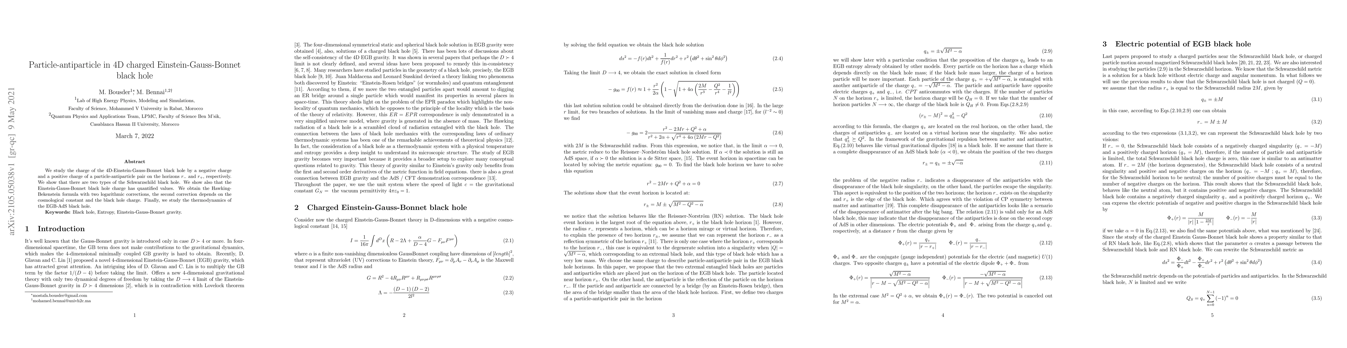 We study the charge of the 4D-Einstein-Gauss-Bonnet black hole by a negative charge and a positive charge of a particle-antiparticle pair on the horizons r- and r+, respectively. We show that there are two types of the Schwarzschild black hole. We show also that the Einstein-Gauss-Bonnet black hole charge has quantified values. We obtain the Hawking-Bekenstein formula with two logarithmic corrections, the second correction depends on the cosmological constant and the black hole charge. Finally, we study the thermodynamics of the EGB-AdS black hole.