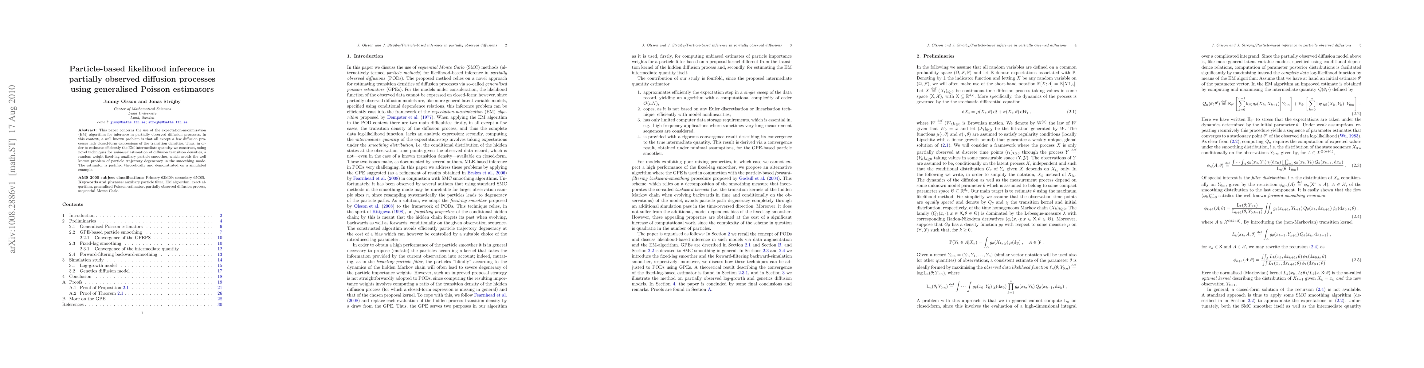 This paper proposes a novel particle-based likelihood inference method using generalised Poisson estimators for partially observed diffusion processes, employing an EM algorithm and a random weight fixed-lag auxiliary particle smoother to avoid particle degeneracy, with theoretical justification and empirical demonstration.