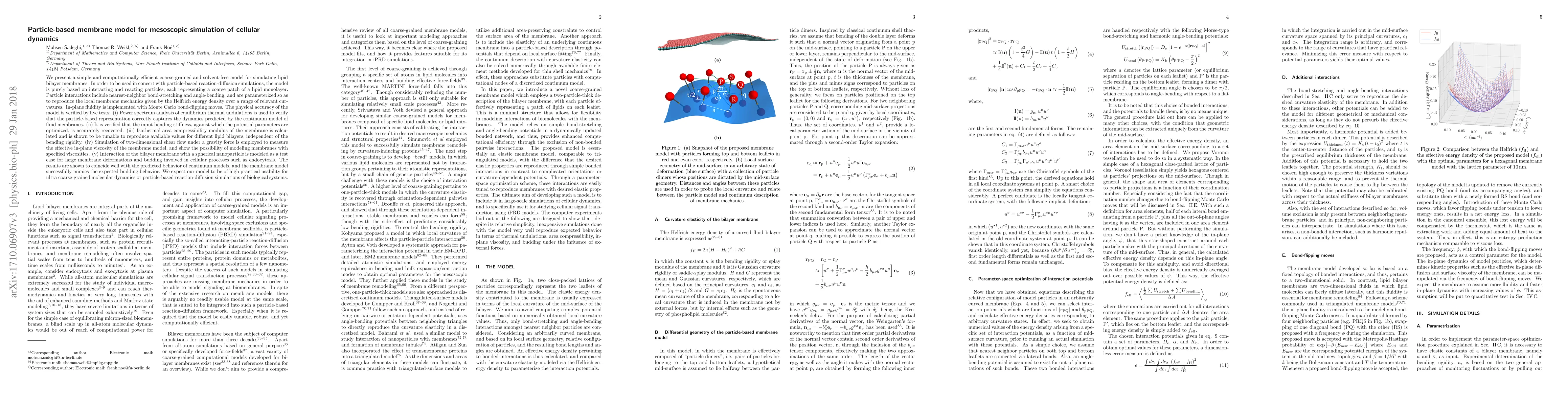 We present a simple and computationally efficient coarse-grained and solvent-free model for simulating lipid bilayer membranes. In order to be used in concert with particle-based reaction-diffusion simulations, the model is purely based on interacting and reacting particles, each representing a coarse patch of a lipid monolayer. Particle interactions include nearest-neighbor bond-stretching and angle-bending, and are parameterized so as to reproduce the local membrane mechanics given by the Helfrich energy density over a range of relevant curvatures. In-plane fluidity is implemented with Monte Carlo bond-flipping moves. The physical accuracy of the model is verified by five tests: (i) Power spectrum analysis of equilibrium thermal undulations is used to verify that the particle-based representation correctly captures the dynamics predicted by the continuum model of fluid membranes. (ii) It is verified that the input bending stiffness, against which the potential parameters are optimized, is accurately recovered. (iii) Isothermal area compressibility modulus of the membrane is calculated and is shown to be tunable to reproduce available values for different lipid bilayers, independent of the bending rigidity. (iv) Simulation of two-dimensional shear flow under a gravity force is employed to measure the effective in-plane viscosity of the membrane model, and show the possibility of modeling membranes with specified viscosities. (v) Interaction of the bilayer membrane with a spherical nanoparticle is modeled as a test case for large membrane deformations and budding involved in cellular processes such as endocytosis...