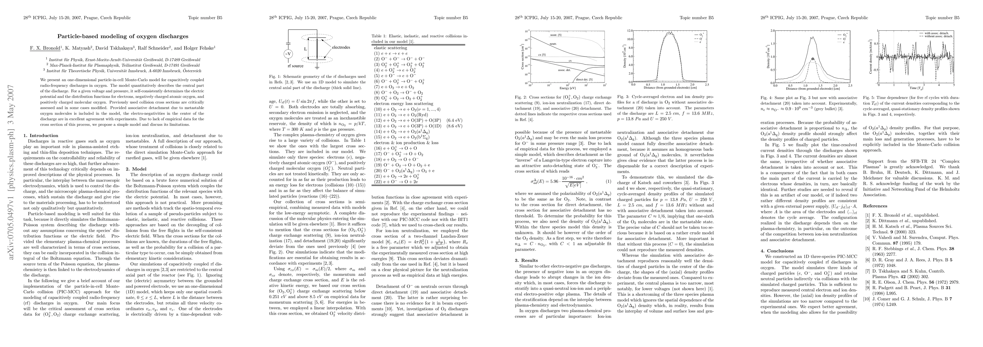 We present an one-dimensional particle-in-cell Monte-Carlo model for capacitively coupled radio-frequency discharges in oxygen. The model quantitatively describes the central part of the discharge. For a given voltage and pressure, it self-consistently determines the electric potential and the distribution functions for electrons, negatively charged atomic oxygen, and positively charged molecular oxygen. Previously used collision cross sections are critically assessed and in some cases modified. Provided associative detachment due to metastable oxygen molecules is included in the model, the electro-negativities in the center of the discharge are in excellent agreement with experiments. Due to lack of empirical data for the cross section of this process, we propose a simple model and discuss its limitations.