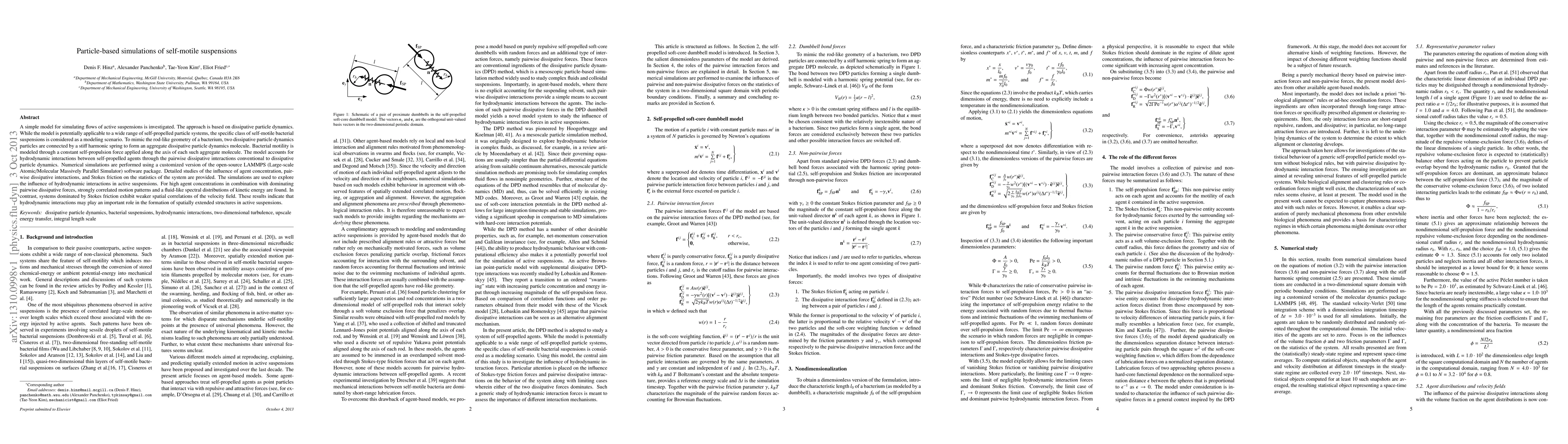 A simple model for simulating flows of active suspensions is investigated. The approach is based on dissipative particle dynamics. While the model is potentially applicable to a wide range of self-propelled particle systems, the specific class of self-motile bacterial suspensions is considered as a modeling scenario. To mimic the rod-like geometry of a bacterium, two dissipative particle dynamics particles are connected by a stiff harmonic spring to form an aggregate dissipative particle dynamics molecule. Bacterial motility is modeled through a constant self-propulsion force applied along the axis of each such aggregate molecule. The model accounts for hydrodynamic interactions between self-propelled agents through the pairwise dissipative interactions conventional to dissipative particle dynamics. Numerical simulations are performed using a customized version of the open-source LAMMPS (Large-scale Atomic/Molecular Massively Parallel Simulator) software package. Detailed studies of the influence of agent concentration, pairwise dissipative interactions, and Stokes friction on the statistics of the system are provided. The simulations are used to explore the influence of hydrodynamic interactions in active suspensions. For high agent concentrations in combination with dominating pairwise dissipative forces, strongly correlated motion patterns and a fluid-like spectral distributions of kinetic energy are found. In contrast, systems dominated by Stokes friction exhibit weaker spatial correlations of the velocity field. These results indicate that hydrodynamic interactions may play an important role in the formation of spatially extended structures in active suspensions.