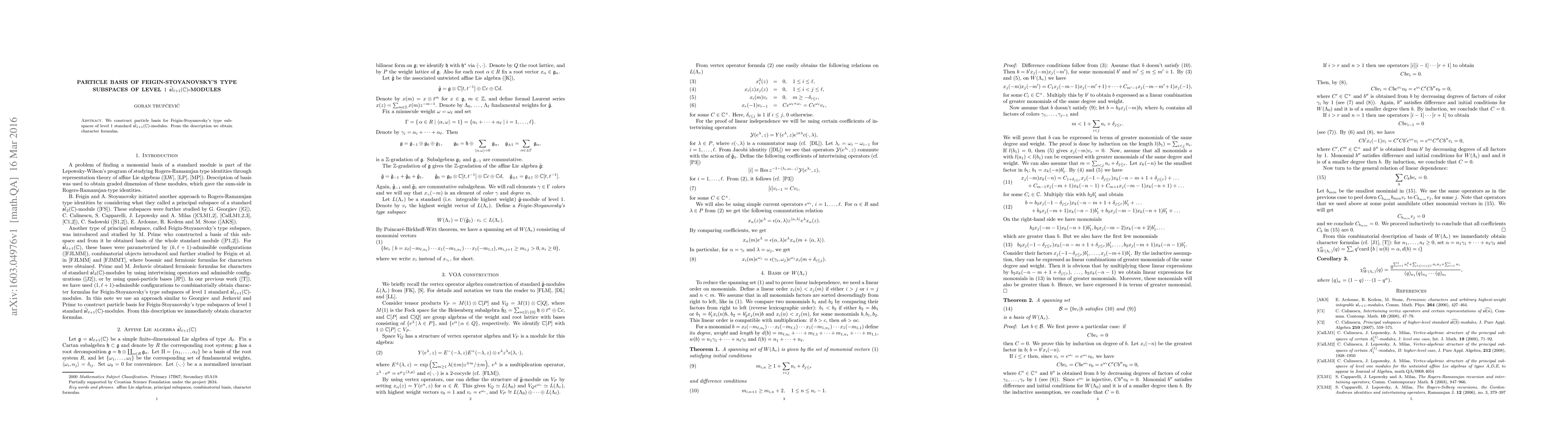 This paper constructs a particle basis for Feigin-Stoyanovsky's type subspaces in level $1$ standard $\tilde{\mathfrak{sl}}_{\ell+1}(\mathbb{C})$-modules, leading to the derivation of character formulas.