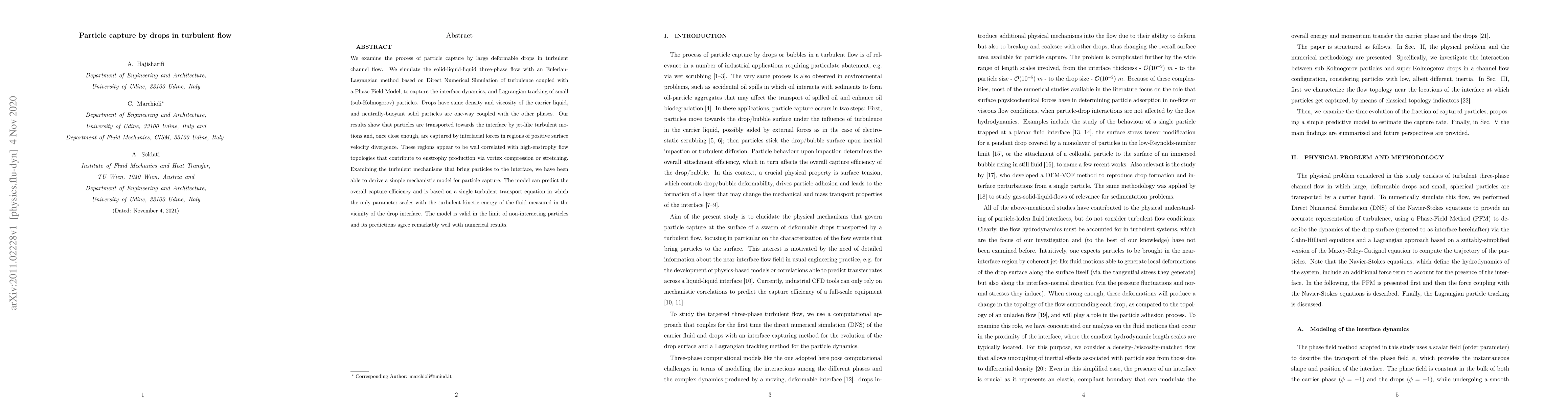 We examine the process of particle capture by large deformable drops in turbulent channel flow. We simulate the solid-liquid-liquid three-phase flow with an Eulerian-Lagrangian method based on Direct Numerical Simulation of turbulence coupled with a Phase Field Model, to capture the interface dynamics, and Lagrangian tracking of small (sub-Kolmogorov) particles. Drops have same density and viscosity of the carrier liquid, and neutrally-buoyant solid particles are one-way coupled with the other phases. Our results show that particles are transported towards the interface by jet-like turbulent motions and, once close enough, are captured by interfacial forces in regions of positive surface velocity divergence. These regions appear to be well correlated with high-enstrophy flow topologies that contribute to enstrophy production via vortex compression or stretching. Examining the turbulent mechanisms that bring particles to the interface, we have been able to derive a simple mechanistic model for particle capture. The model can predict the overall capture efficiency and is based on a single turbulent transport equation in which the only parameter scales with the turbulent kinetic energy of the fluid measured in the vicinity of the drop interface. The model is valid in the limit of non-interacting particles and its predictions agree remarkably well with numerical results.