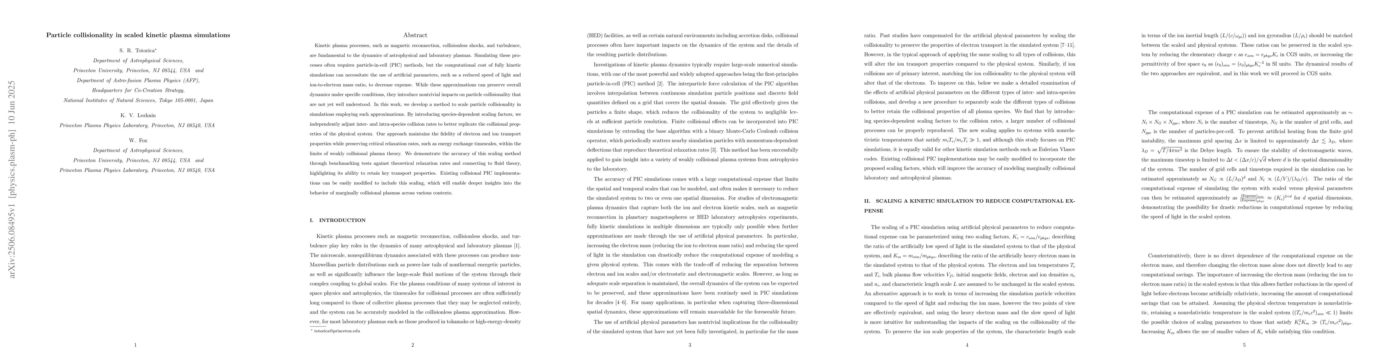 Researchers developed a method to scale particle collisionality in kinetic plasma simulations, enabling more accurate models of marginally collisional plasmas. This approach retains key transport properties while preserving critical relaxation rates in weakly collisional plasma theory.