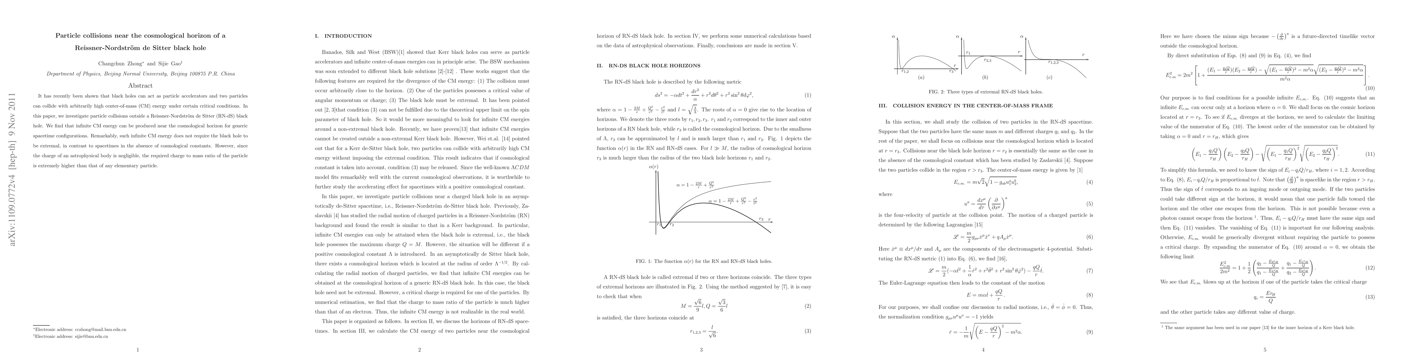 It has recently been shown that black holes can act as particle accelerators and two particles can collide with arbitrarily high center-of-mass (CM) energy under certain critical conditions. In this paper, we investigate particle collisions outside a Reissner-Nordstr\"om de Sitter (RN-dS) black hole. We find that infinite CM energy can be produced near the cosmological horizon for generic spacetime configurations. Remarkably, such infinite CM energy does not require the black hole to be extremal, in contrast to spacetimes in the absence of cosmological constants. However, since the charge of an astrophysical body is negligible, the required charge to mass ratio of the particle is extremely higher than that of any elementary particle.