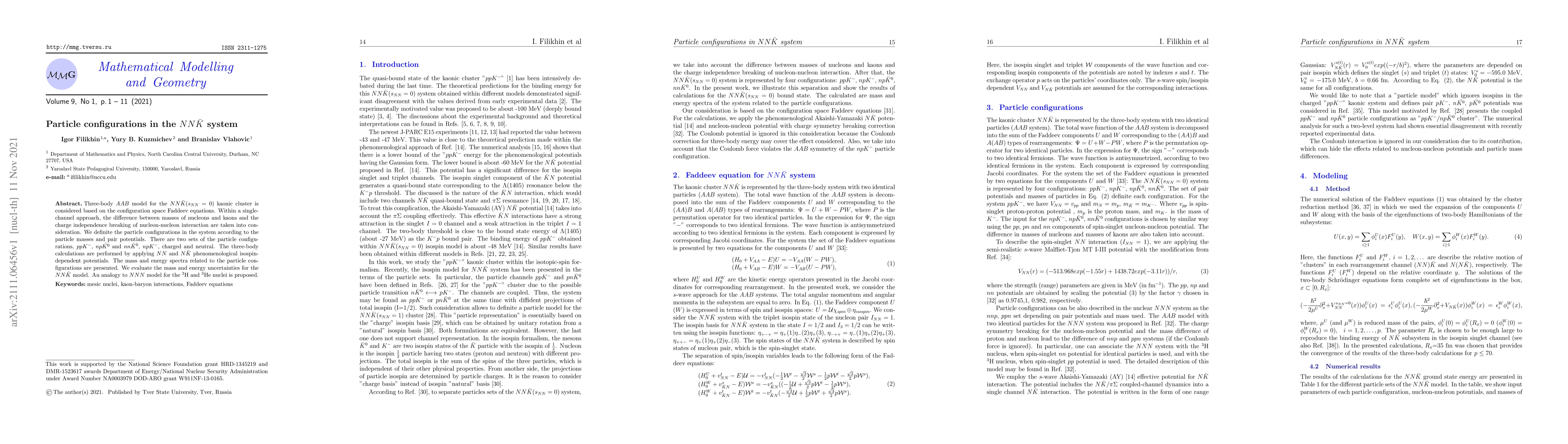 This paper explores the $NN\bar K$ system using a three-body $AAB$ model based on Faddeev equations, analyzing configurations like $ppK^-$, $np\bar K^0$, and $nn\bar K^0$. It evaluates mass and energy spectra, assesses uncertainties, and proposes an analogy to the $NNN$ model in triton and helion nuclei.