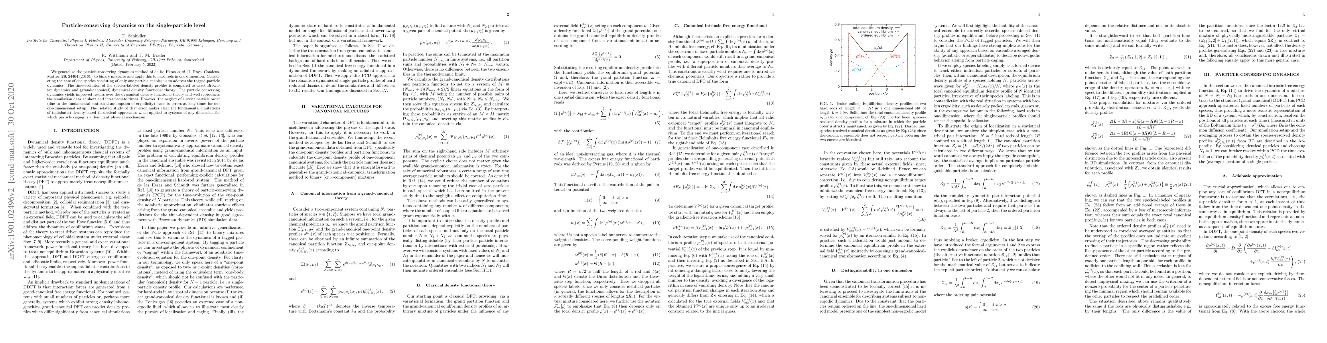 We generalize the particle-conserving dynamics method of de las Heras et al. [J. Phys. Condens. Matter: 28, 24404 (2016).] to binary mixtures and apply this to hard rods in one dimension. Considering the case of one species consisting of only one particle enables us to address the tagged-particle dynamics. The time-evolution of the species-labeled density profiles is compared to exact Brownian dynamics and (grand-canonical) dynamical density functional theory. The particle conserving dynamics yields improved results over the dynamical density functional theory and well reproduces the simulation data at short and intermediate times. However, the neglect of a strict particle order (due to the fundamental statistical assumption of ergodicity) leads to errors at long times for our one-dimensional setup. The isolated study of that error makes clear the fundamental limitations of (adiabatic) density-based theoretical approaches when applied to systems of any dimension for which particle caging is a dominant physical mechanism.
