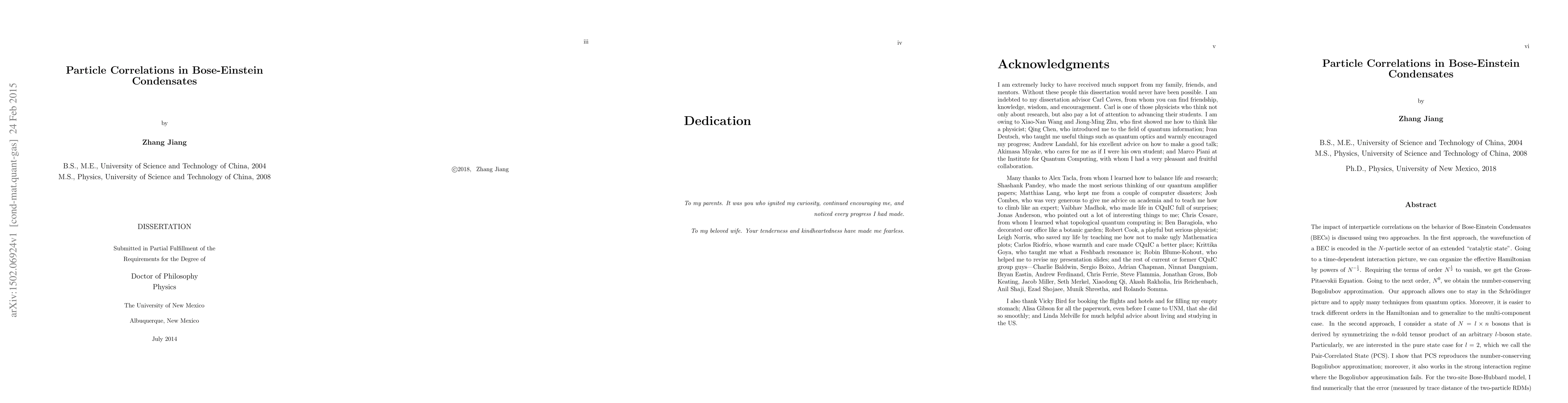 The impact of interparticle correlations on the behavior of Bose-Einstein Condensates (BECs) is discussed using two approaches. In the first approach, the wavefunction of a BEC is encoded in the $N$-particle sector of an extended "catalytic state". Going to a time-dependent interaction picture, we can organize the effective Hamiltonian by powers of ${N}^{-1/2}$. Requiring the terms of order ${N}^{1/2}$ to vanish, we get the Gross-Pitaevskii Equation. Going to the next order, $N^0$, we obtain the number-conserving Bogoliubov approximation. Our approach allows one to stay in the Schr\"{o}dinger picture and to apply many techniques from quantum optics. Moreover, it is easier to track different orders in the Hamiltonian and to generalize to the multi-component case. In the second approach, I consider a state of $N =l\times n$ bosons that is derived by symmetrizing the $n$-fold tensor product of an arbitrary $l$-boson state. Particularly, we are interested in the pure state case for $l=2$, which we call the Pair-Correlated State (PCS). I show that PCS reproduces the number-conserving Bogoliubov approximation; moreover, it also works in the strong interaction regime where the Bogoliubov approximation fails. For the two-site Bose-Hubbard model, I find numerically that the error (measured by the trace distance of the two-particle reduced density matrices) of PCS is less than two percent over the entire parameter space, thus making PCS a bridge between the superfluid and Mott insulating phases. Amazingly, the error of PCS does not increase, in the time-dependent case, as the system evolves for longer times. I derive both time-dependent and -independent equations for the ground state and the time evolution of the PCS ansatz. The time complexity of simulating PCS does not depend on $N$ and is linear in the number of orbitals in use.