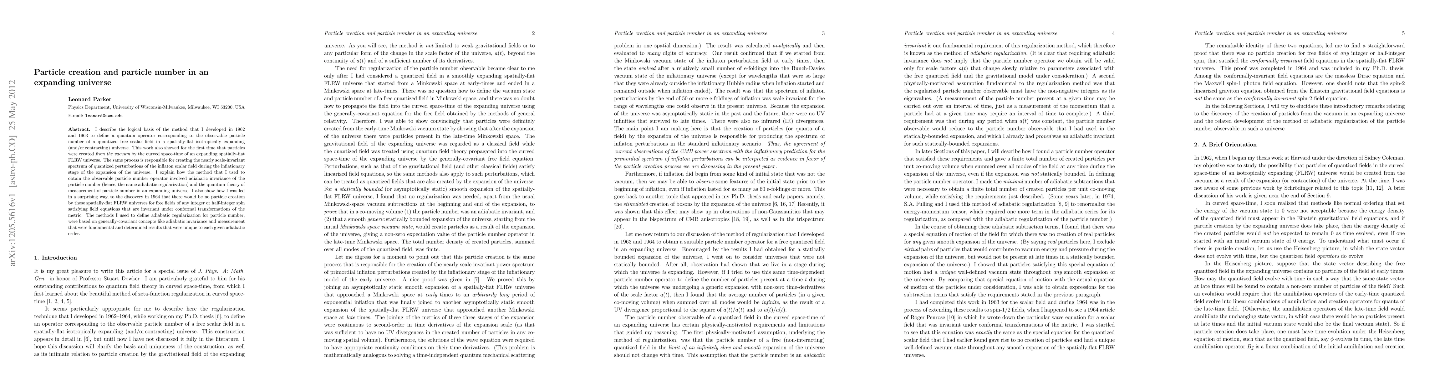 This paper outlines the development of a quantum operator for particle number in an expanding universe, revealing the creation of particles from the vacuum due to the curved space-time of an expanding FLRW universe, and the application of adiabatic regularization to define this operator. It also discusses the absence of particle creation for fields invariant under conformal transformations.