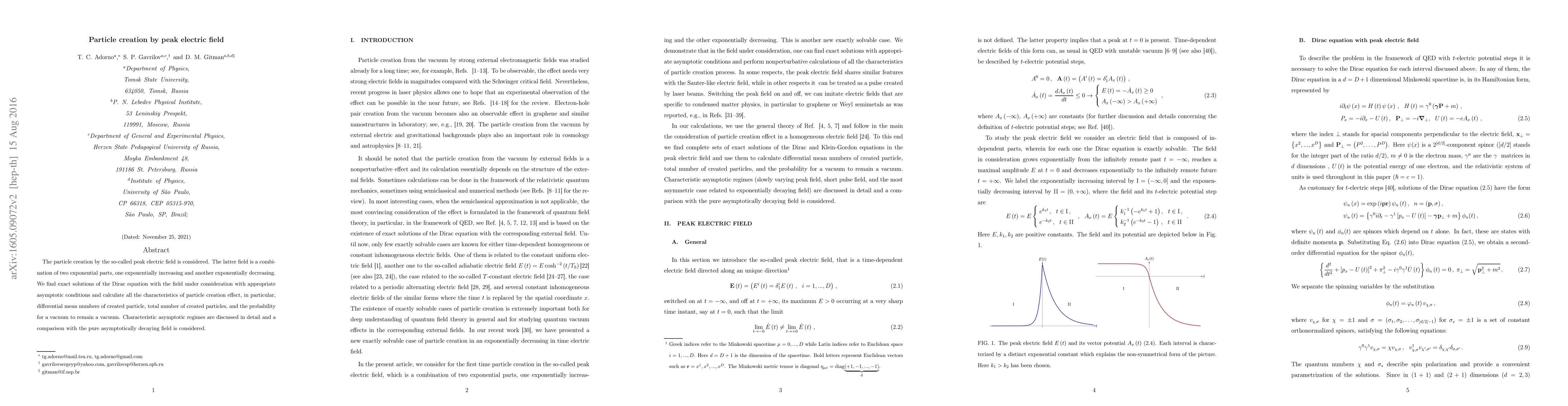 The particle creation by the so-called peak electric field is considered. The latter field is a combination of two exponential parts, one exponentially increasing and another exponentially decreasing. We find exact solutions of the Dirac equation with the field under consideration with appropriate asymptotic conditions and calculate all the characteristics of particle creation effect, in particular, differential mean numbers of created particle, total number of created particles, and the probability for a vacuum to remain a vacuum. Characteristic asymptotic regimes are discussed in detail and a comparison with the pure asymptotically decaying field is considered.