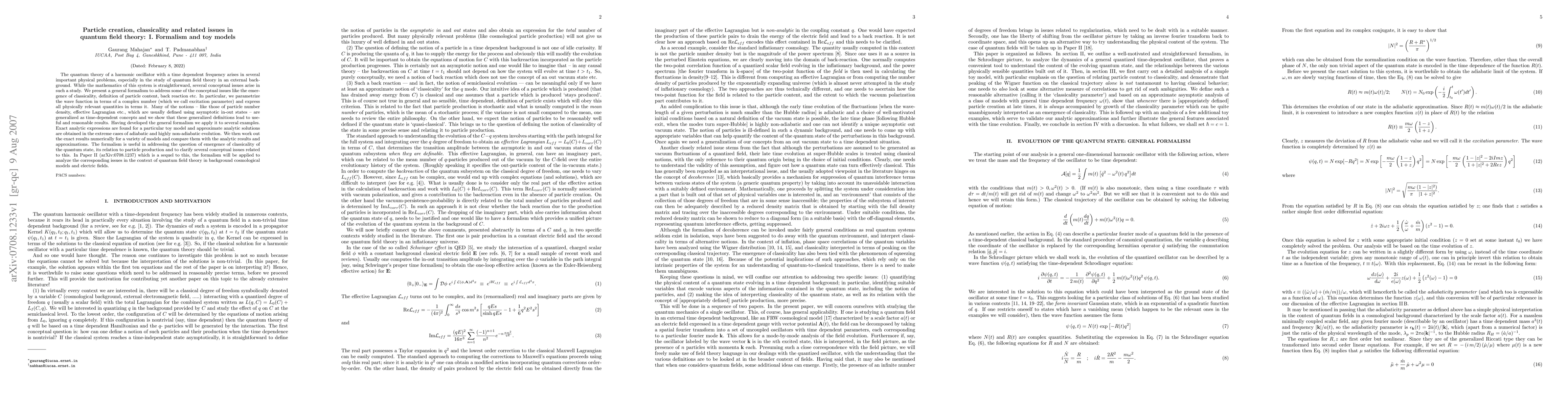 This paper develops a formalism to address conceptual issues in quantum field theory, such as the emergence of classicality and particle content, using a time-dependent harmonic oscillator model. It presents a parametrization of the wave function and generalizes time-dependent concepts like particle number density, applying the formalism to toy models and comparing exact, approximate, and numerical results.