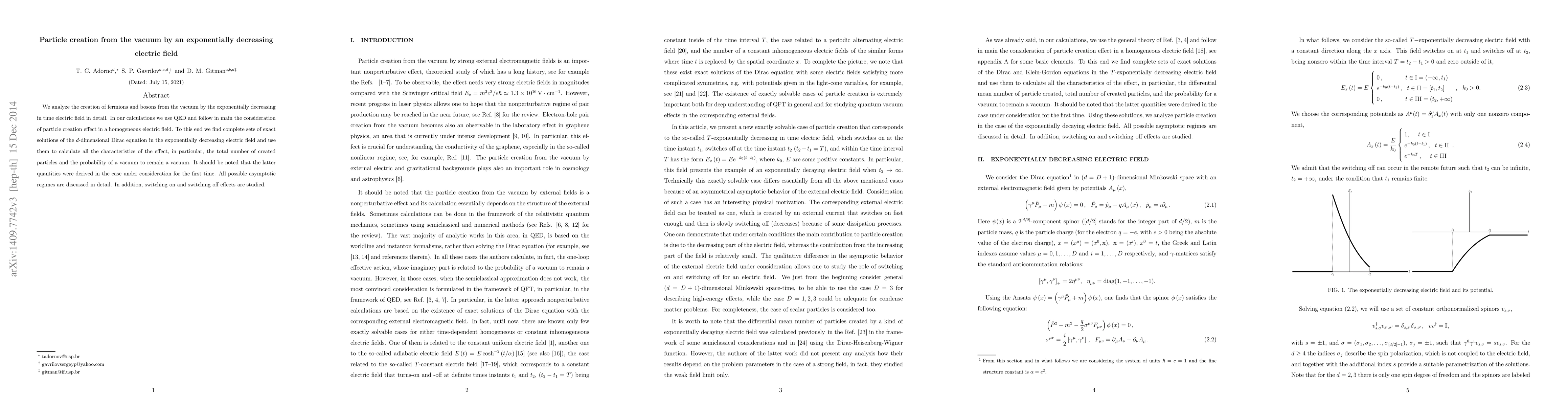 This paper investigates the creation of fermions and bosons from vacuum by an exponentially decreasing electric field using QED. It derives exact solutions of the $d$-dimensional Dirac equation under such a field and calculates the total number of created particles and the probability of vacuum remaining empty, providing new insights into the switching on and off effects.