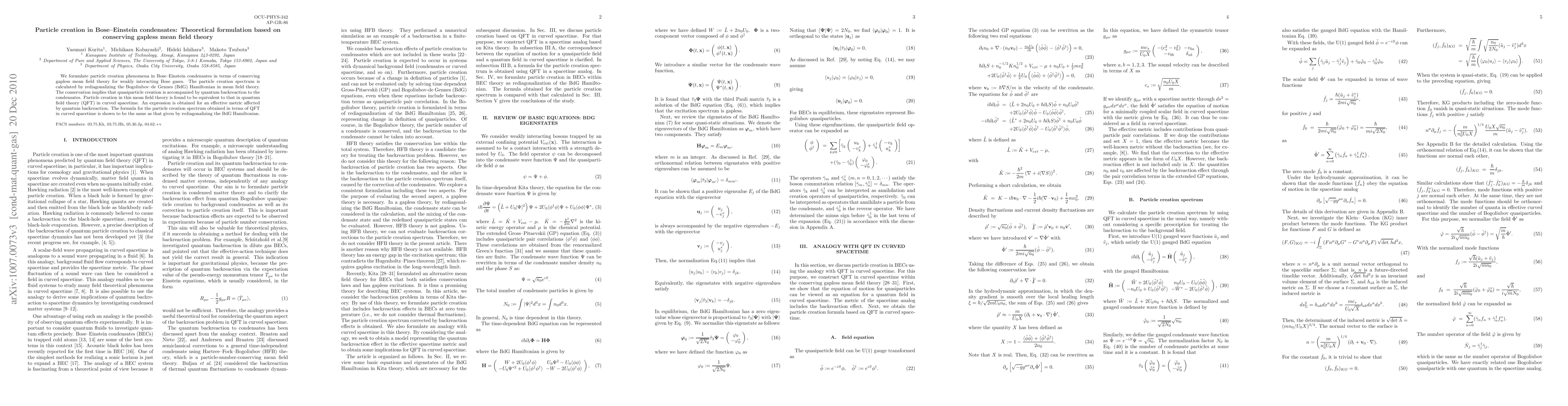 This paper formulates particle creation in Bose-Einstein condensates using conserving gapless mean field theory, showing equivalence to quantum field theory in curved spacetime. The particle creation spectrum is derived by rediagonalizing the Bogoliubov-de Gennes Hamiltonian and includes an effective metric influenced by quantum backreaction.