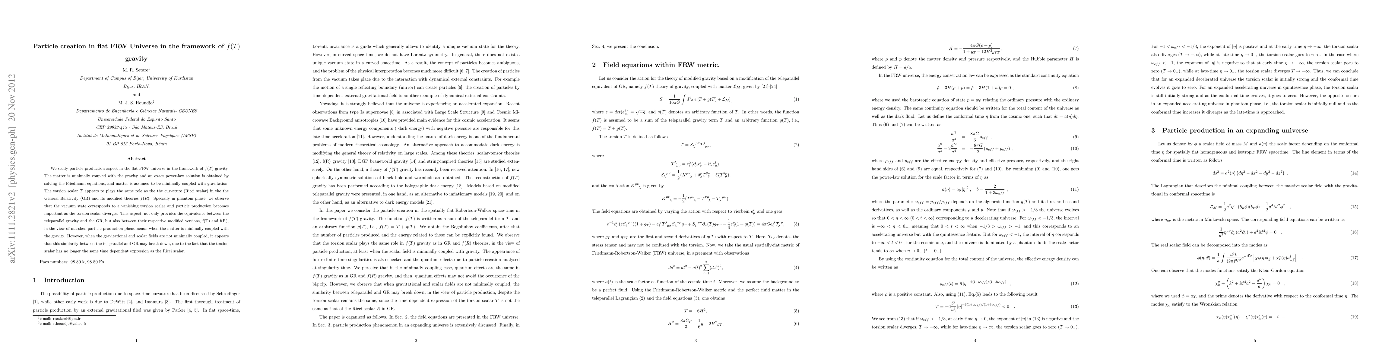 We study particle production aspect in the flat FRW universe in the framework of $f(T)$ gravity. The matter is minimally coupled with the gravity and an exact power-law solution is obtained by solving the Friedmann equations, and matter is assumed to be minimally coupled with gravitation. The torsion scalar $T$ appears to plays the same role as the the curvature (Ricci scalar) in the the General Relativity (GR) and its modified theories $f(R)$. Specially in phantom phase, we observe that the vacuum state corresponds to a vanishing torsion scalar and particle production becomes important as the torsion scalar diverges. This aspect, not only provides the equivalence between the teleparallel gravity and the GR, but also between their respective modified versions, f(T) and f(R), in the view of massless particle production phenomenon when the matter is minimally coupled with the gravity. However, when the gravitational and scalar fields are not minimally coupled, it appears that this similarity between the teleparallel and GR may break down, due to the fact that the torsion scalar has no longer the same time dependent expression as the Ricci scalar.