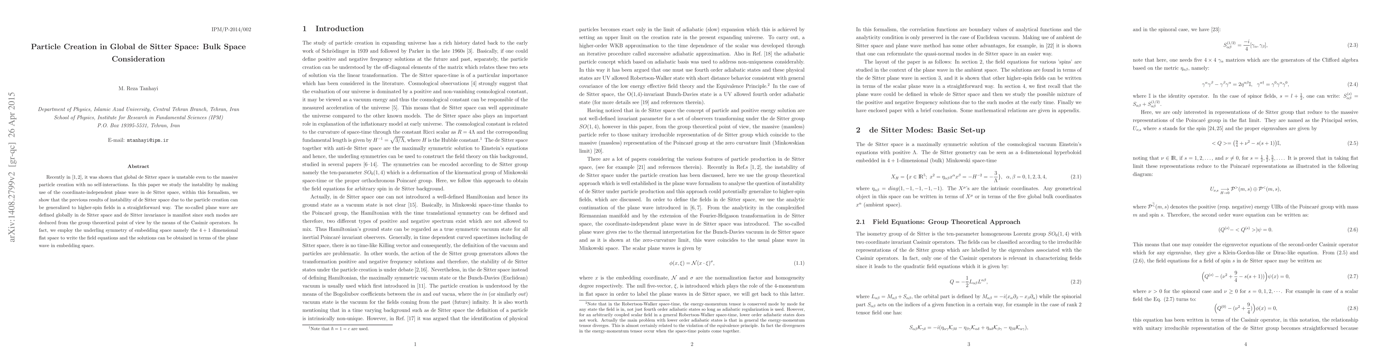 This paper investigates the instability of global de Sitter space due to massive particle creation, extending previous findings to higher-spin fields. It utilizes coordinate-independent plane waves defined globally in de Sitter space, leveraging the underlying symmetry of the embedding $4+1$ dimensional flat space to derive field equations and solutions.