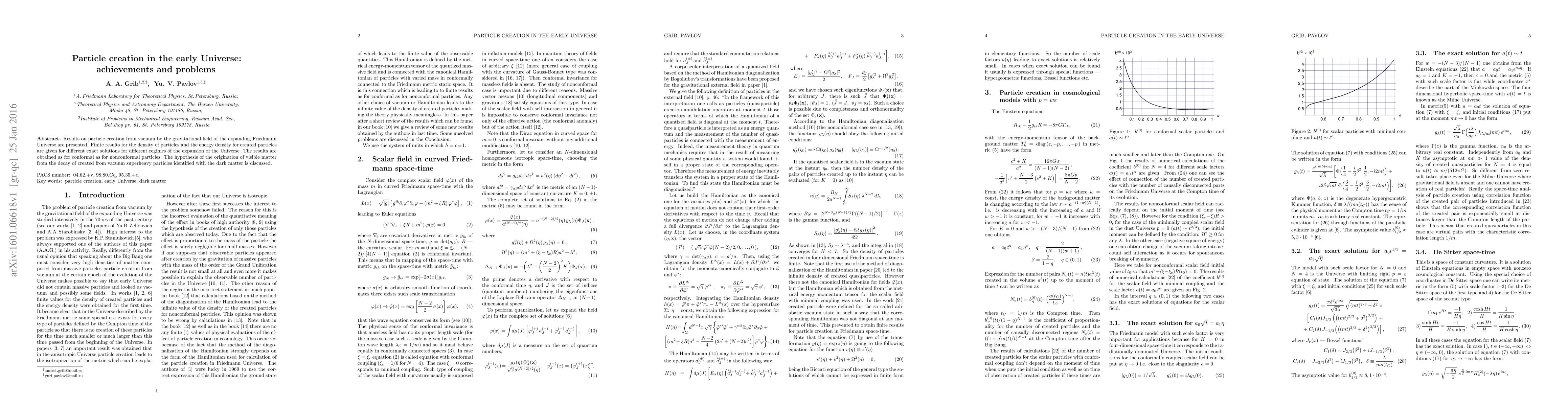 This paper presents results on particle creation from vacuum due to the gravitational field of an expanding Friedmann Universe, providing finite density and energy density for both conformal and nonconformal particles. It also explores the hypothesis that visible matter originates from the decay of superheavy particles created from vacuum, potentially identifying them with dark matter.