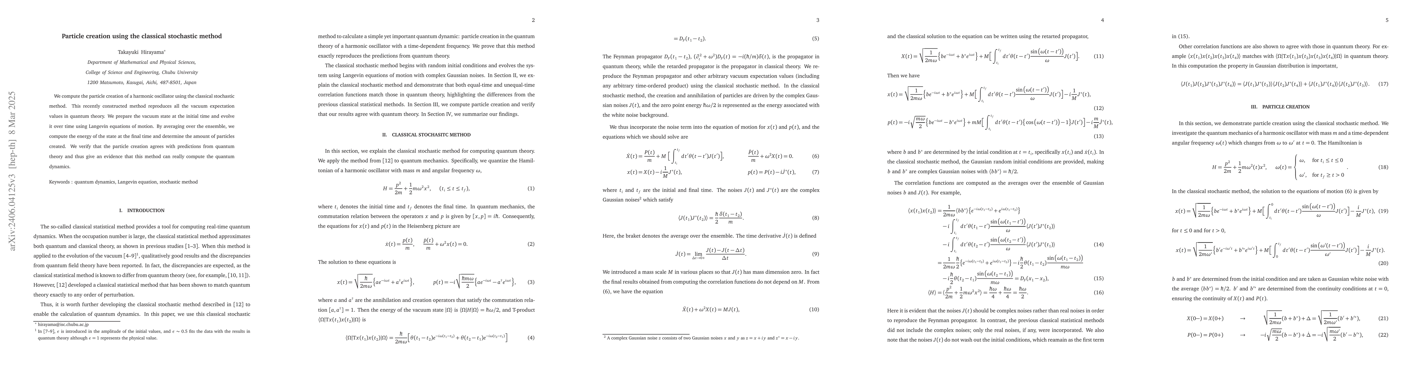 This research applies the classical stochastic method to compute particle creation in a harmonic oscillator, showing agreement with quantum predictions. It evolves the vacuum state using Langevin equations and measures particle creation by averaging over the ensemble.