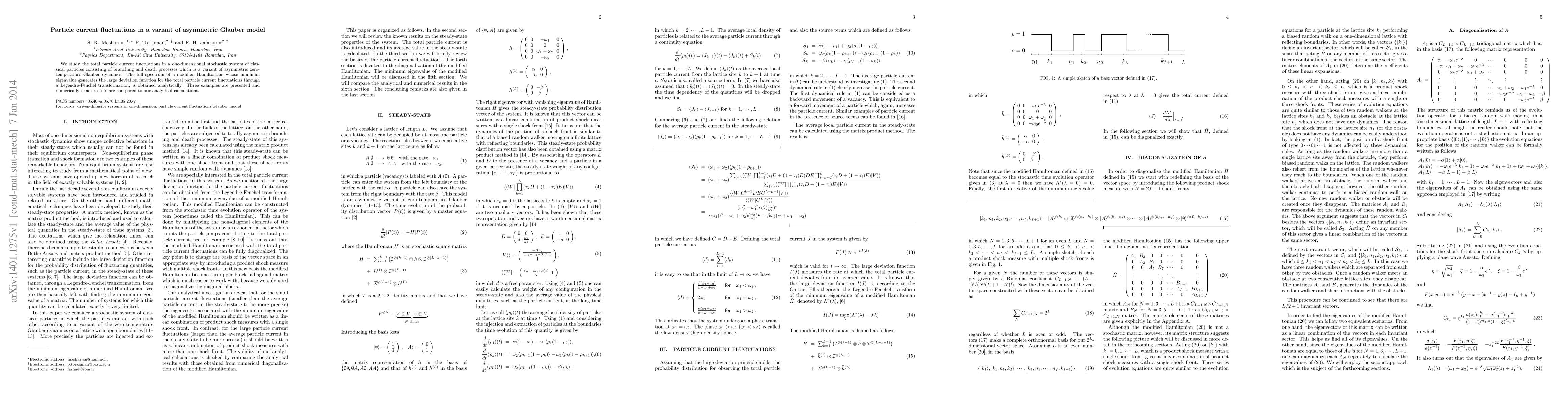 Researchers studied particle current fluctuations in a one-dimensional system with branching and death processes, analyzing its modified Hamiltonian to predict total current fluctuations.