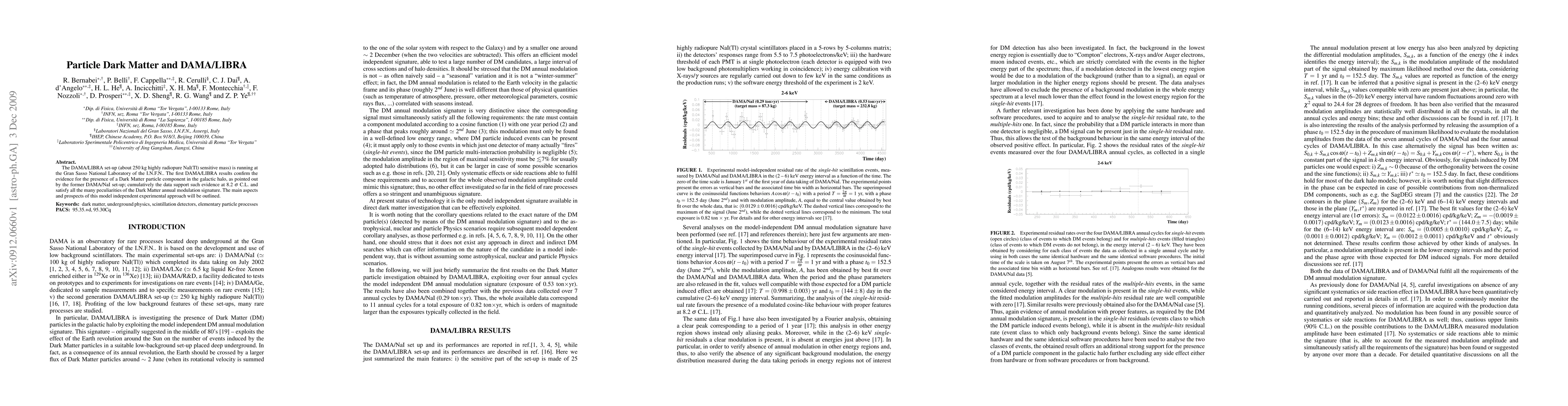 The DAMA/LIBRA experiment confirms the presence of a Dark Matter particle component in the galactic halo with 8.2 sigma confidence, supporting the annual modulation signature, and outlines a model-independent approach to detecting such particles.