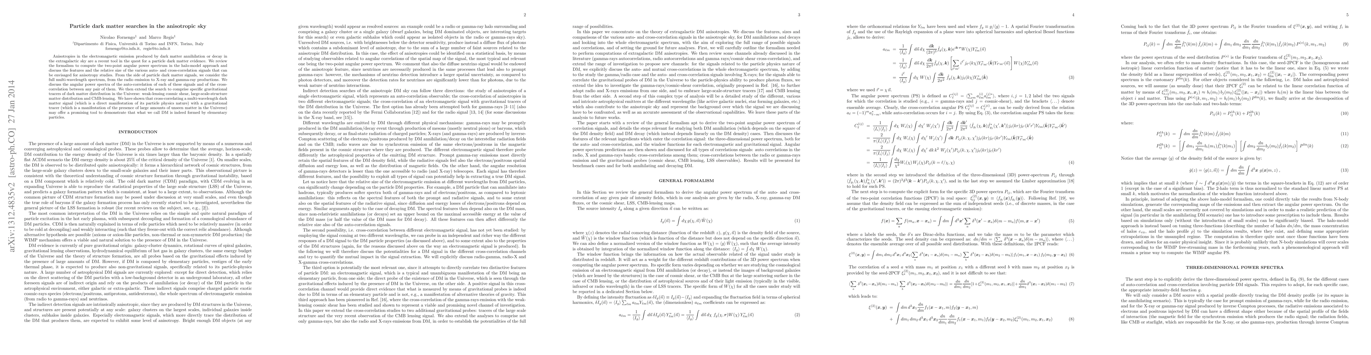 The paper reviews the formalism to compute the two-point angular power spectrum in the halo-model approach, discussing various auto- and cross-correlation signals for anisotropy studies in dark matter searches. It considers the full multi-wavelength spectrum from radio to X-ray and gamma-ray productions, extending the search to include specific gravitational tracers of dark matter distribution.