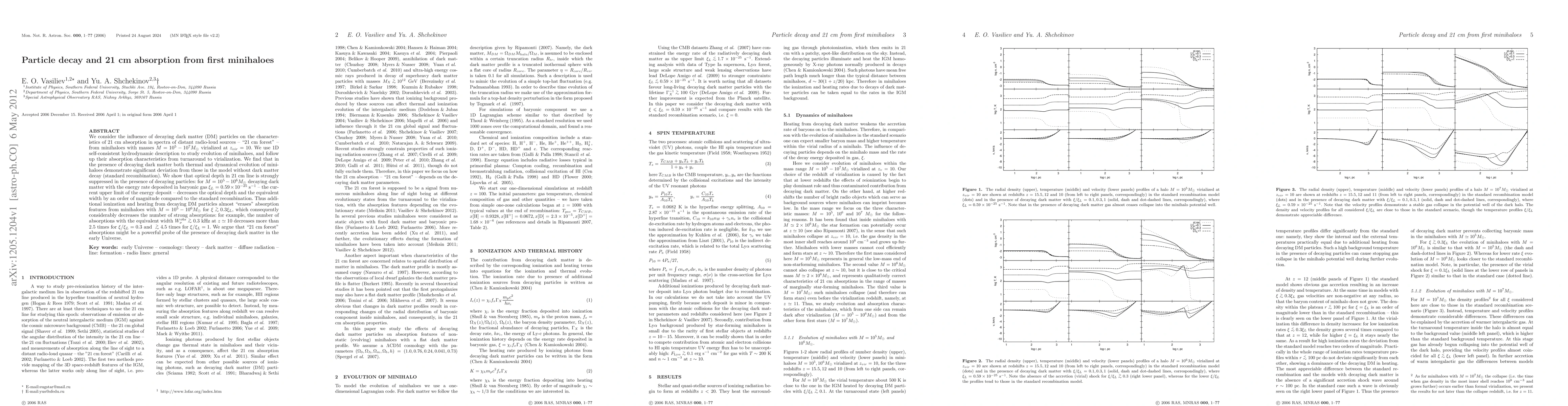 We consider the influence of decaying dark matter (DM) particles on the characteristics of 21 cm absorption in spectra of distant radio-loud sources - "21 cm forest" - from minihaloes with masses $M=10^5-10^7\msun$ virialized at $z_{vir} = 10$. We use 1D self-consistent hydrodynamic description to study evolution of minihaloes, and follow up their absorption characteristics from turnaround to virialization. We find that in the presence of decaying dark matter both thermal and dynamical evolution of minihaloes demonstrate significant deviation from those in the model without dark matter decay (standard recombination). We show that optical depth in 21 cm line is strongly suppressed in the presence of decaying particles: for $M=10^5-10^6\msun$ decaying dark matter with the energy rate deposited in baryonic gas $\xi_{L} = 0.59\times 10^{-25}$ s$^{-1}$ - the current upper limit of the energy deposit - decreases the optical depth and the equivalent width by an order of magnitude compared to the standard recombination. Thus additional ionization and heating from decaying DM particles almost "erases" absorption features from minihaloes with $M=10^5-10^6\msun$ for $\xi \simgt 0.3\xi_L$, which consequently considerably decreases the number of strong absorptions: for example, the number of absorptions with the equivalent width $W_\nu^{obs} \simgt 0.3$ kHz at $z\simeq10$ decreases more than 2.5 times for $\xi/\xi_{L} = 0.3$ and $\simgt$4.5 times for $\xi/\xi_{L} = 1$. We argue that "21 cm forest" absorptions might be a powerful probe of the presence of decaying dark matter in the early Universe.