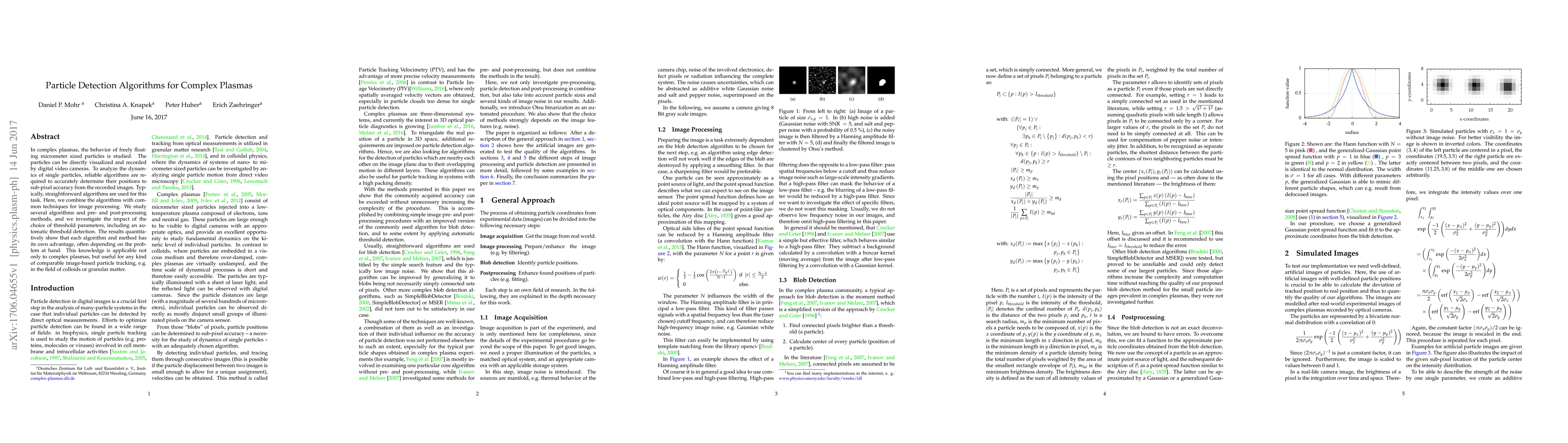 This paper investigates various particle detection algorithms for analyzing the dynamics of micrometer-sized particles in complex plasmas, combining traditional methods with advanced image processing techniques. The study finds that different algorithms and parameter settings yield varying levels of accuracy, providing valuable insights for image-based particle tracking in complex plasmas and other fields like colloids and granular matter.