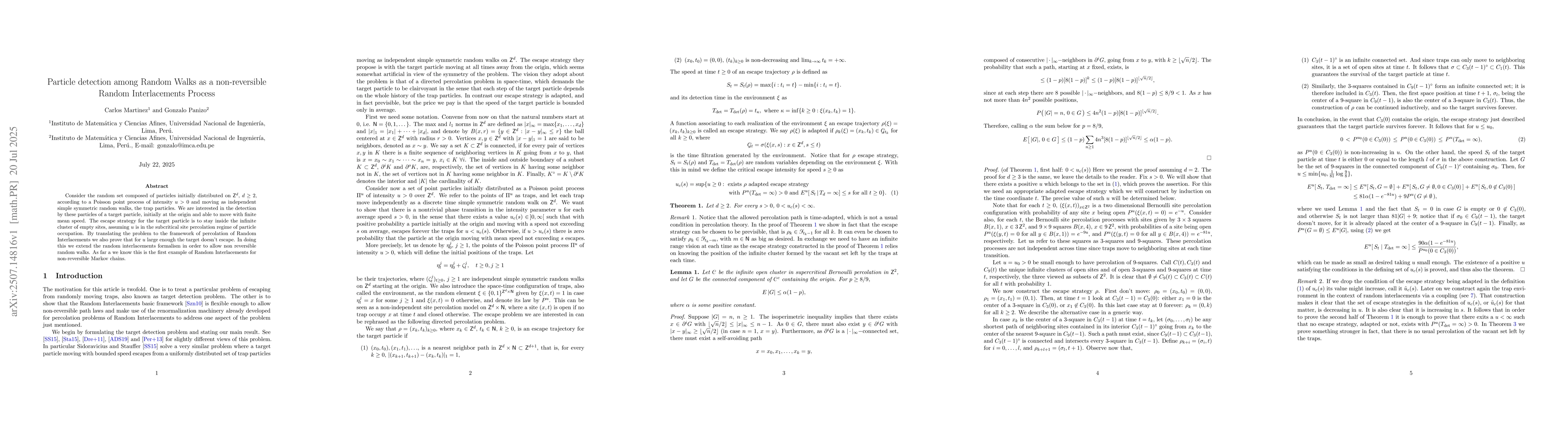 Consider the random set composed of particles initially distributed on Zd, d >= 2, according to a Poisson point process of intensity u > 0 and moving as independent simple symmetric random walks, the trap particles. We are interested in the detection by these particles of a target particle, initially at the origin and able to move with finite mean speed. The escape strategy for the target particle is to stay inside the infinite cluster of empty sites, assuming u is in the subcritical site percolation regime of particle occupation. By translating the problem to the framework of percolation of Random Interlacements we also prove that for u large enough the target doesn't escape. In doing this we extend the random interlacements formalism in order to allow non reversible random walks. As far a we know this is the first example of Random Interlacements for non-reversible Markov chains.