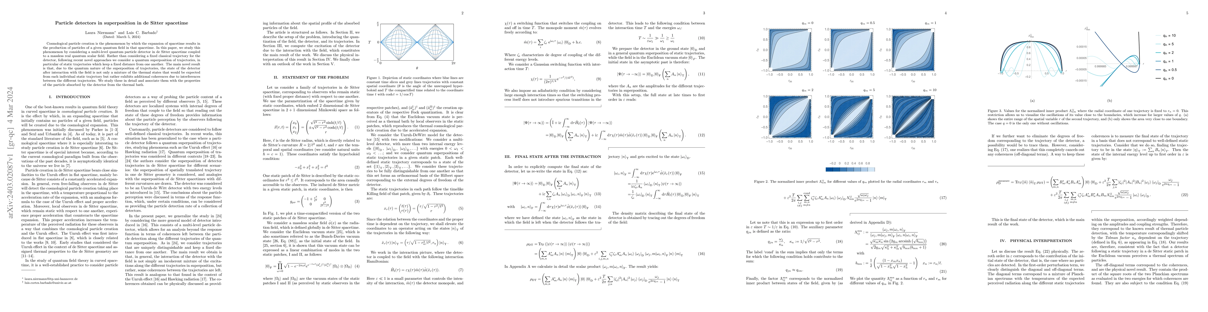 This paper investigates the phenomenon of cosmological particle creation in de Sitter spacetime using a multi-level quantum particle detector in superposition. The study reveals that the detector's state after interacting with a scalar field exhibits not just thermal states but also coherences due to interference between different static trajectories in the superposition.