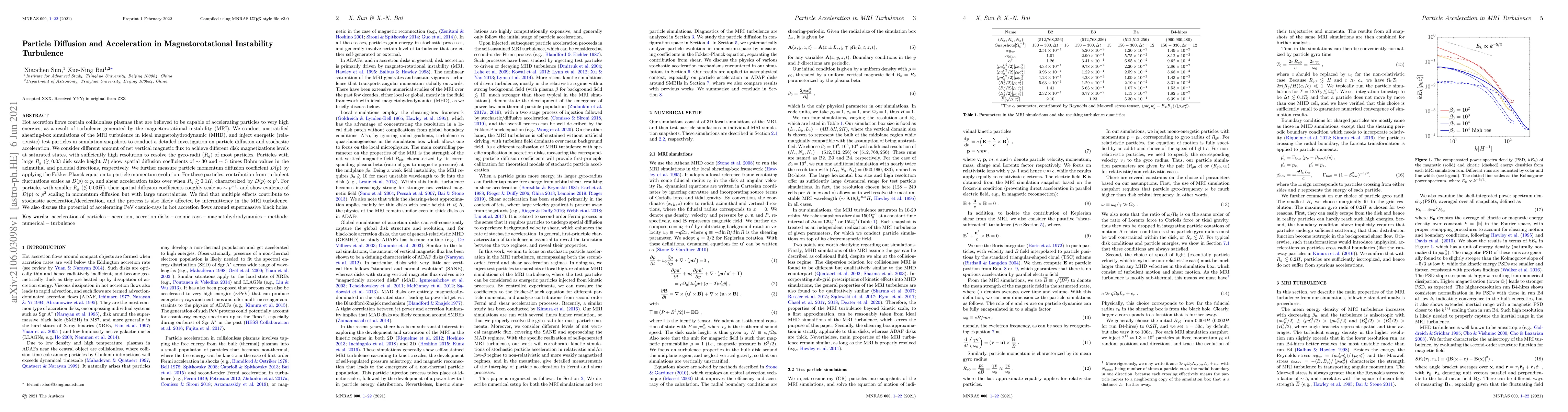 This study investigates particle diffusion and acceleration in magnetorotational instability (MRI) turbulence using high-resolution MHD simulations. It finds that large particles exhibit significant spatial diffusion and momentum diffusion proportional to their momentum, with shear acceleration dominating for particles with gyro-radii larger than 0.1 disk scale height.