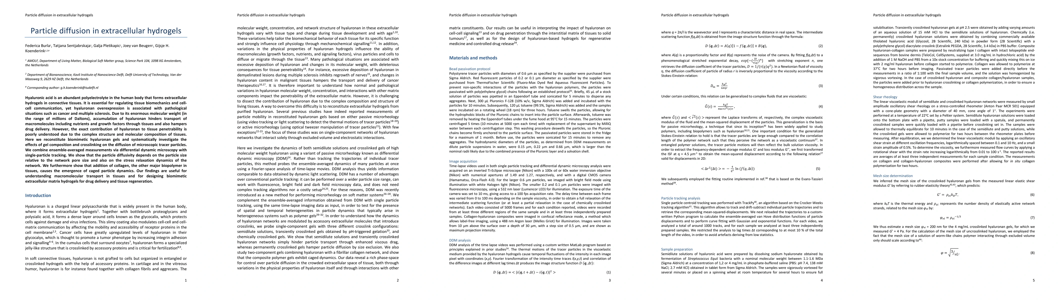 Researchers created biomimetic hyaluronan gels to study how particles diffuse through tissues, finding that particle size and network stress affect diffusion rates, with added collagen causing 'caged' dynamics.