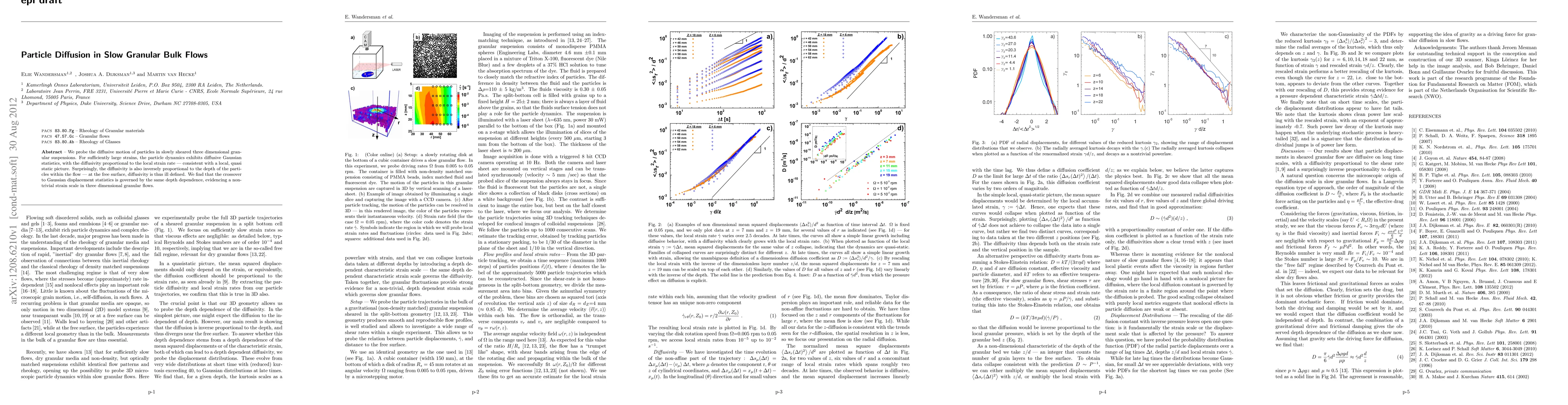We probe the diffusive motion of particles in slowly sheared three dimensional granular suspensions. For sufficiently large strains, the particle dynamics exhibits diffusive Gaussian statistics, with the diffusivity proportional to the local strain rate - consistent with a local, quasi static picture. Surprisingly, the diffusivity is also inversely proportional to the depth of the particles within the flow - at the free surface, diffusivity is thus ill defined. We find that the crossover to Gaussian displacement statistics is governed by the same depth dependence, evidencing a non-trivial strain scale in three dimensional granular flows.