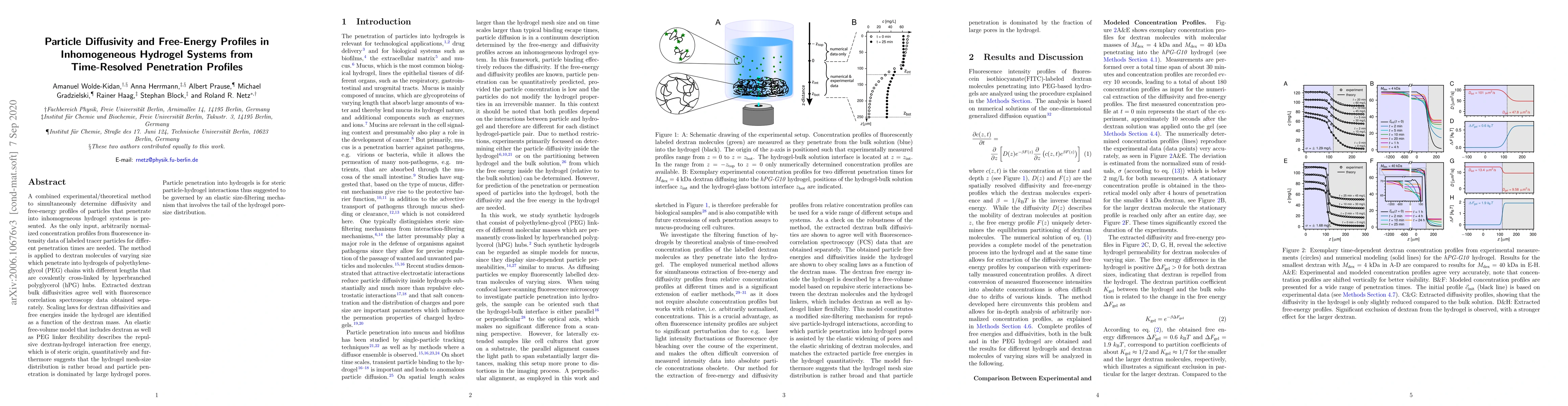 A combined experimental/theoretical method to simultaneously determine diffusivity and free-energy profiles of particles that penetrate into inhomogeneous hydrogel systems is presented. As the only input, arbitrarily normalized concentration profiles from fluorescence intensity data of labeled tracer particles for different penetration times are needed. The method is applied to dextran molecules of varying size which penetrate into hydrogels of polyethylene-glycol (PEG) chains with different lengths that are covalently cross-linked by hyperbranched polyglycerol (hPG) hubs. Extracted dextran bulk diffusivities agree well with fluorescence correlation spectroscopy data obtained separately. Scaling laws for dextran diffusivities and free energies inside the hydrogel are identified as a function of the dextran mass. An elastic free-volume model that includes dextran as well as PEG linker flexibility describes the repulsive dextran-hydrogel interaction free energy, which is of steric origin, quantitatively and furthermore suggests that the hydrogel mesh-size distribution is rather broad and particle penetration is dominated by large hydrogel pores. Particle penetration into hydrogels is for steric particle-hydrogel interactions thus suggested to be governed by an elastic size-filtering mechanism that involves the tail of the hydrogel pore-size distribution.
