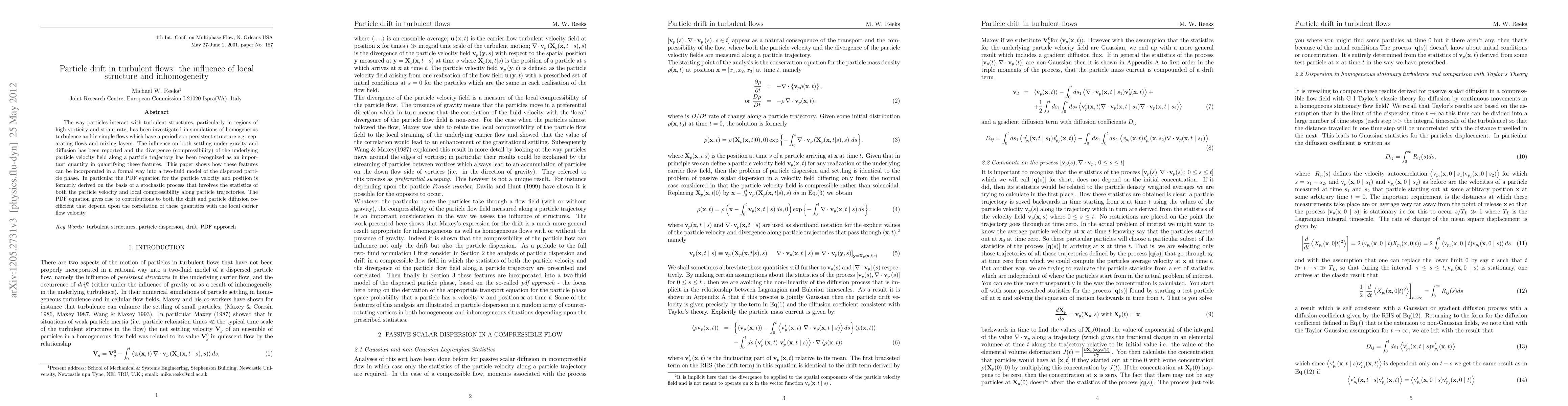 The way particles interact with turbulent structures, particularly in regions of high vorticity and strain rate, has been investigated in simulations of homogeneous turbulence and in simple flows which have a periodic or persistent structure e.g. separating flows and mixing layers. The influence on both settling under gravity and diffusion has been reported and the divergence (compressibility) of the underlying particle velocity field along a particle trajectory has been recognized as an important quantity in quantifying these features. This paper shows how these features can be incorporated in a formal way into a two-fluid model of the dispersed particle phase. In particular the PDF equation for the particle velocity and position is formerly derived on the basis of a stochastic process that involves the statistics of both the particle velocity and local compressibility along particle trajectories. The PDF equation gives rise to contributions to both the drift and particle diffusion coefficient that depend upon the correlation of these quantities with the local carrier flow velocity. Key Words: turbulent structures, particle dispersion, drift, PDF approach