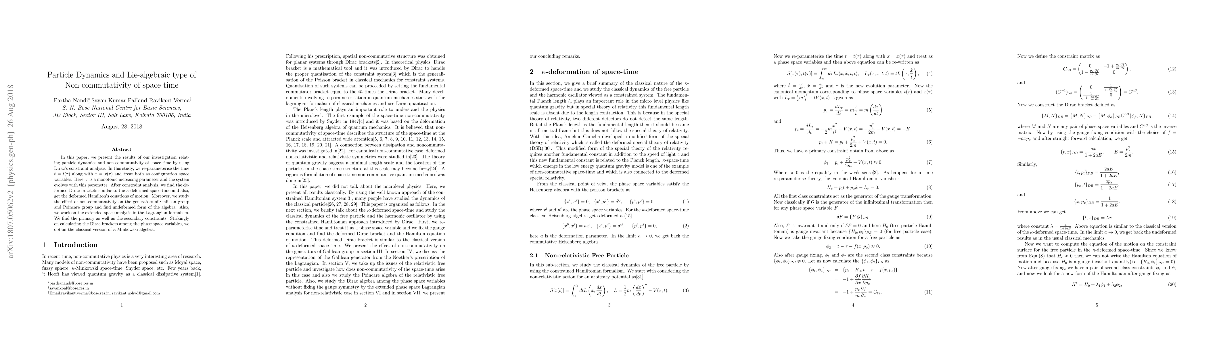 In this paper, we present the results of our investigation relating particle dynamics and non-commutativity of space-time by using Dirac's constraint analysis. In this study, we re-parameterise the time $t=t(\tau)$ along with $x=x(\tau)$ and treat both as configuration space variables. Here, $\tau$ is a monotonic increasing parameter and the system evolves with this parameter. After constraint analysis, we find the deformed Dirac brackets similar to the $\kappa$-deformed space-time and also, get the deformed Hamilton's equations of motion. Moreover, we study the effect of non-commutativity on the generators of Galilean group and Poincare group and find undeformed form of the algebra. Also, we work on the extended space analysis in the Lagrangian formalism. We find the primary as well as the secondary constraints. Strikingly on calculating the Dirac brackets among the phase space variables, we obtain the classical version of $\kappa$-Minkowski algebra.