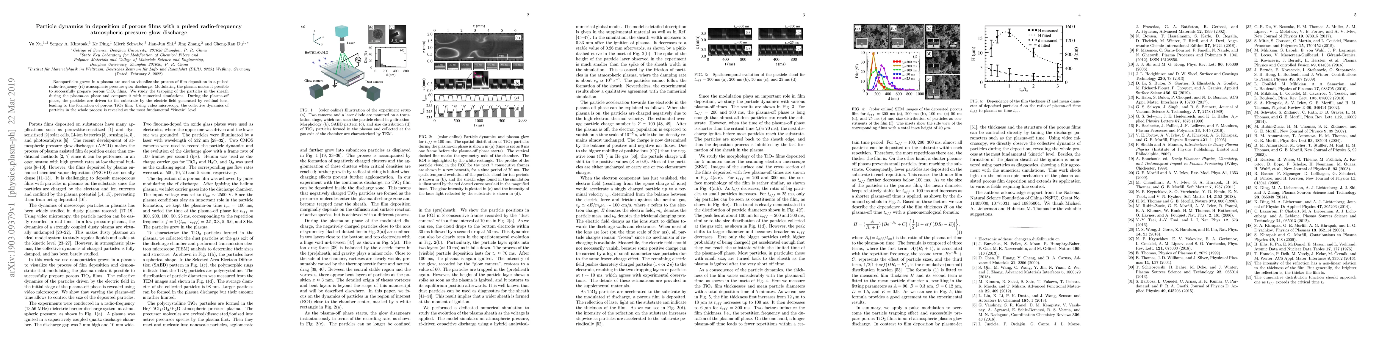 This paper investigates the particle dynamics in the deposition of porous TiO2 films using pulsed radio-frequency atmospheric pressure glow discharge, revealing the trapping of nanoparticles in the sheath during the plasma-on phase and their subsequent movement to the substrate during the plasma-off phase driven by residual ions. Numerical simulations and video microscopy are used to elucidate the fundamental kinetic processes involved.