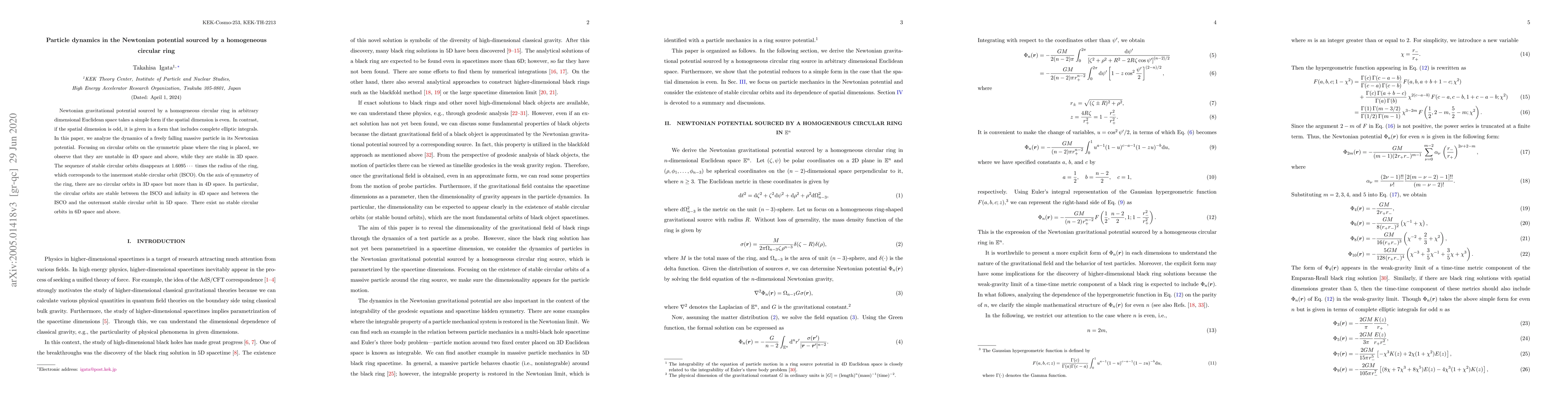 This paper examines the dynamics of a particle in the Newtonian potential of a homogeneous circular ring, finding that circular orbits are stable in 3D but unstable in 4D and higher dimensions. The stability and existence of orbits vary with the spatial dimension, with no stable orbits in 6D or higher.