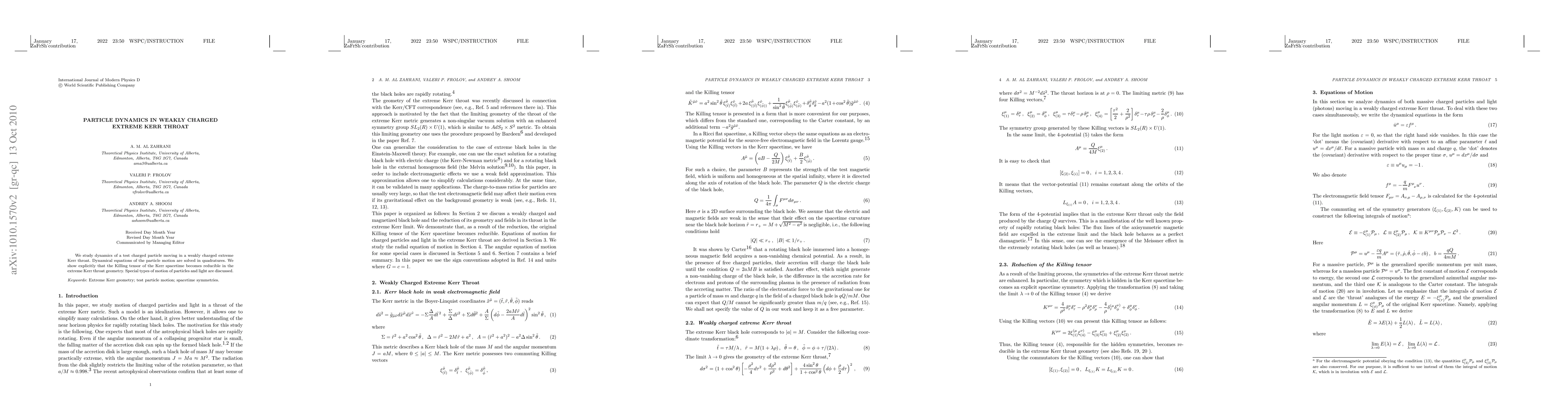 This paper explores the dynamics of a charged particle in a weakly charged extreme Kerr throat, solving the dynamical equations in quadratures. It demonstrates that the Killing tensor in this geometry becomes reducible, highlighting special types of particle and light motion.