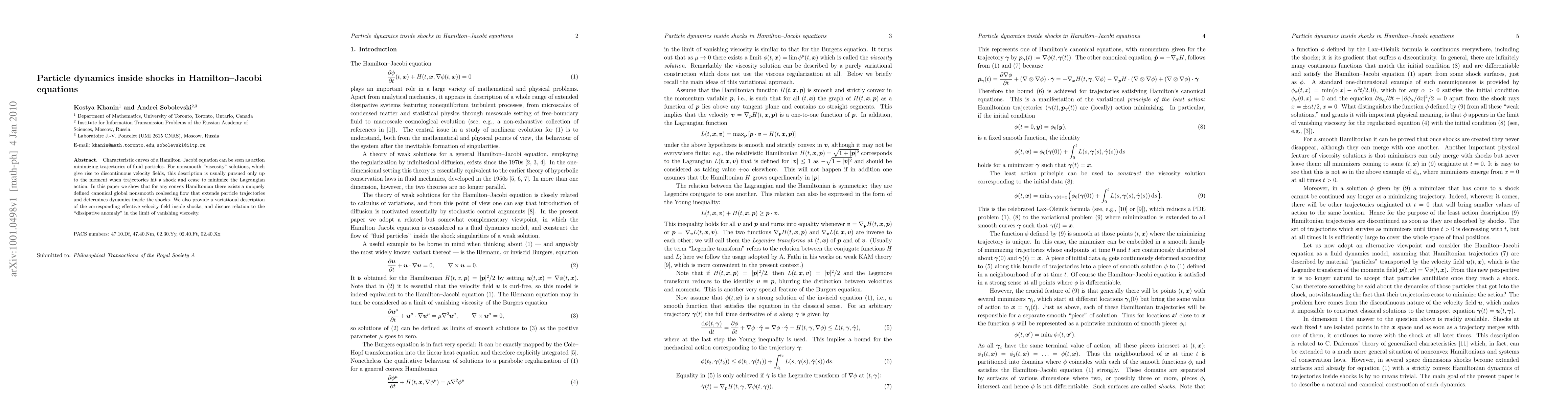 Characteristics of a Hamilton-Jacobi equation can be seen as action minimizing trajectories of fluid particles. For nonsmooth "viscosity" solutions, which give rise to discontinuous velocity fields, this description is usually pursued only up to the moment when trajectories hit a shock and cease to minimize the Lagrangian action. In this paper we show that for any convex Hamiltonian there exists a uniquely defined canonical global nonsmooth coalescing flow that extends particle trajectories and determines dynamics inside the shocks. We also provide a variational description of the corresponding effective velocity field inside shocks, and discuss relation to the "dissipative anomaly" in the limit of vanishing viscosity.