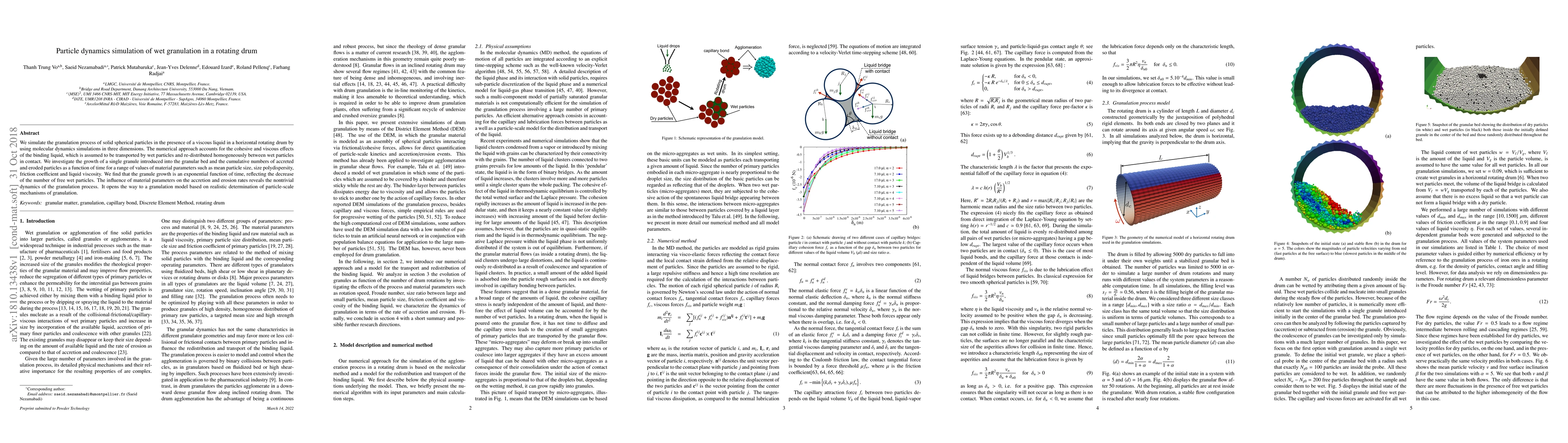 This paper uses molecular dynamics simulations to study the wet granulation process of solid particles in a rotating drum, focusing on granule growth and the effects of material parameters. The results show that granule growth follows an exponential time function, highlighting the complex dynamics influenced by factors like particle size and liquid viscosity.