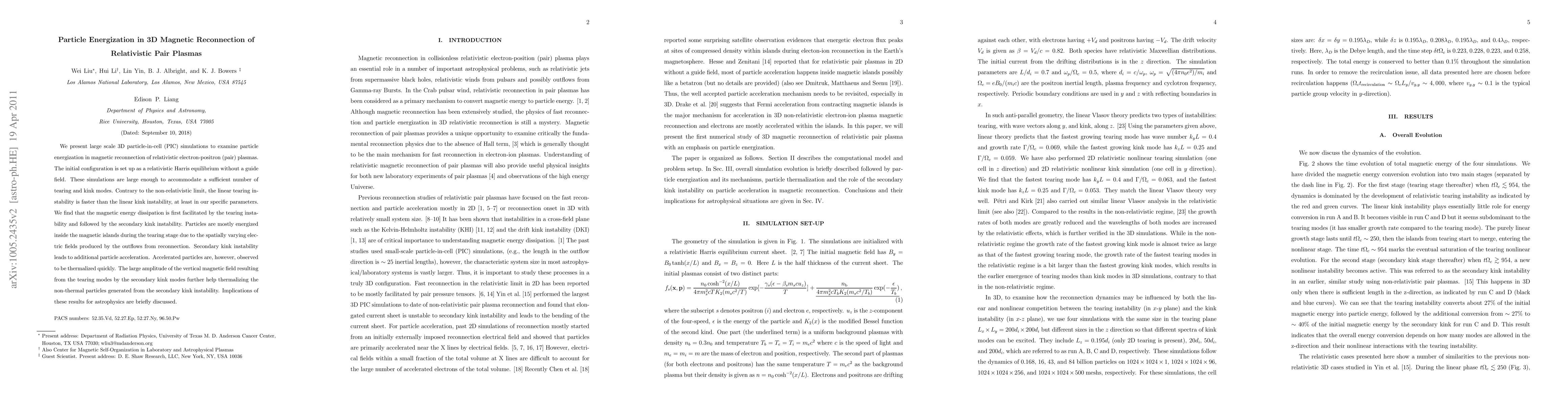 This study uses large-scale 3D PIC simulations to investigate particle energization in magnetic reconnection of relativistic pair plasmas, revealing that tearing instability precedes kink instability, leading to initial particle energization within magnetic islands, followed by secondary kink instability for further acceleration, though thermalization of accelerated particles occurs quickly.