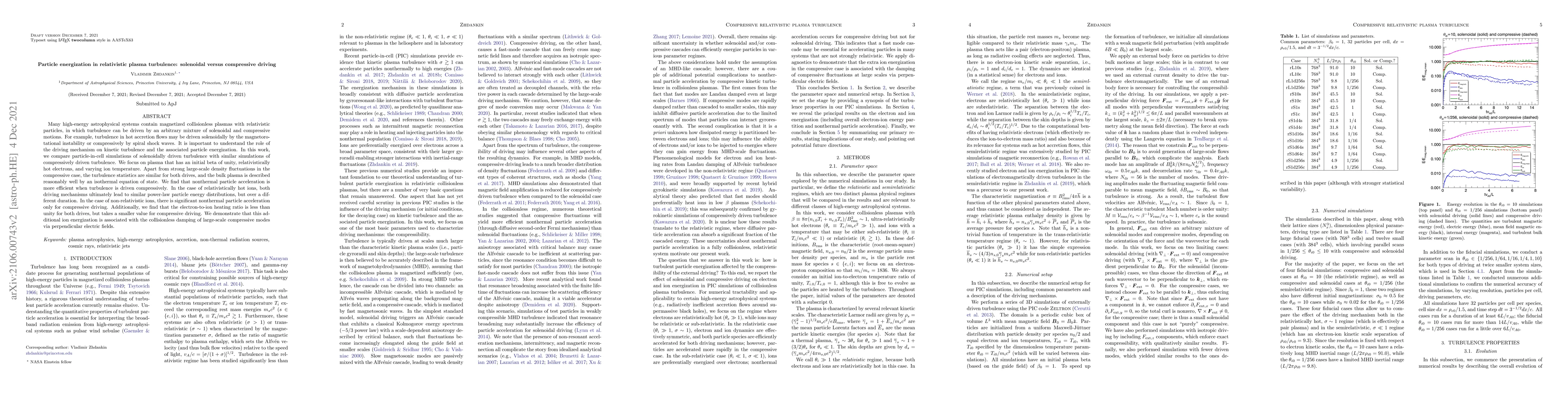 This paper compares particle-in-cell simulations of relativistic plasma turbulence driven by solenoidal and compressive motions, finding that compressive driving is more efficient for nonthermal particle acceleration, especially for non-relativistic ions. Compressive driving also results in a lower electron-to-ion heating ratio due to the collisionless damping of large-scale compressive modes.