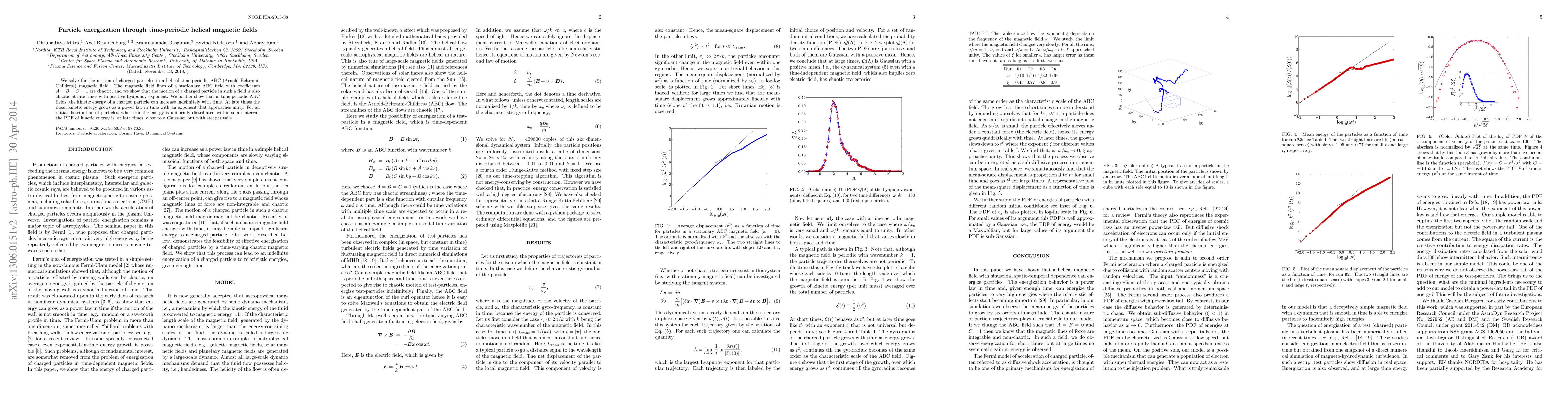 This paper investigates charged particle motion in time-periodic helical magnetic fields, demonstrating chaotic behavior and indefinite kinetic energy increase. The mean kinetic energy grows as a power law with time, and the energy distribution approaches a Gaussian with steeper tails at late times.