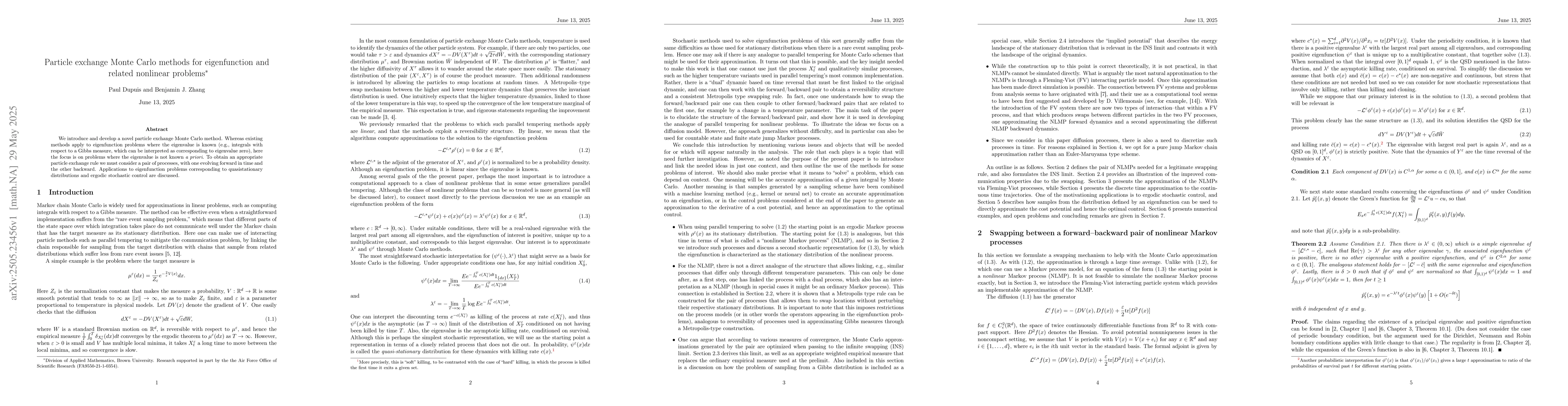 The paper presents a new particle exchange Monte Carlo framework that couples forward and backward processes, facilitating the solution of eigenfunction problems with unknown eigenvalues.