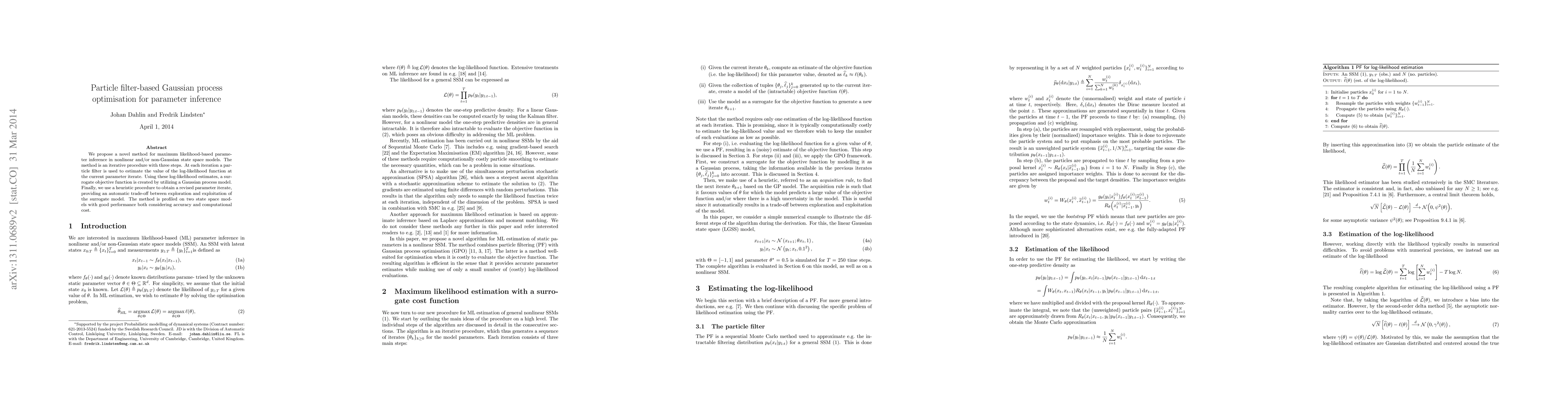 We propose a novel method for maximum likelihood-based parameter inference in nonlinear and/or non-Gaussian state space models. The method is an iterative procedure with three steps. At each iteration a particle filter is used to estimate the value of the log-likelihood function at the current parameter iterate. Using these log-likelihood estimates, a surrogate objective function is created by utilizing a Gaussian process model. Finally, we use a heuristic procedure to obtain a revised parameter iterate, providing an automatic trade-off between exploration and exploitation of the surrogate model. The method is profiled on two state space models with good performance both considering accuracy and computational cost.